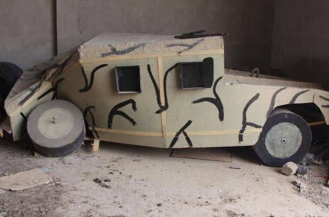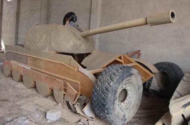 Bölgedeki internet sitelerinin haberlerine göre, savaş bölgelerinde kullandıkları araçları tekerleklerine kadar zırh ile donatan DEAŞ'ın hava saldırılarından korunmak ve hedef şaşırtmak için Musul'da yaptıkları ahşap tank, zırhlı araç ve silahlar ele geçirildi.