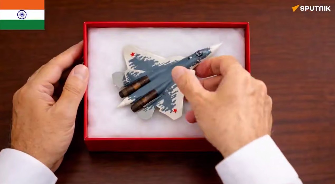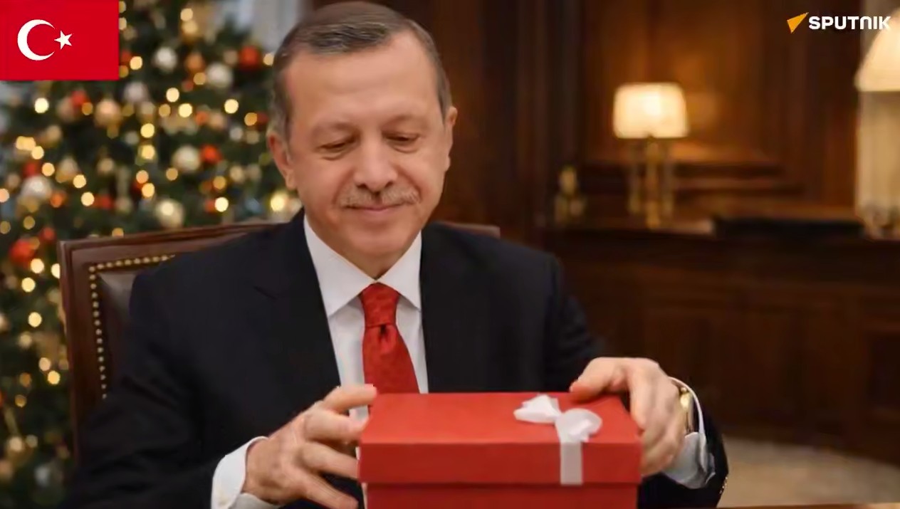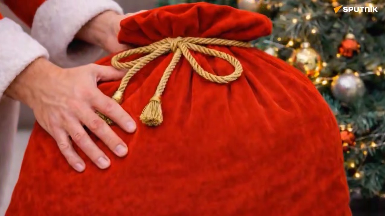 Sputnik tarafından yayınlanan video, Putin'in sırtında taşıdığı kırmızı bir hediye bohçası ile başlıyor.