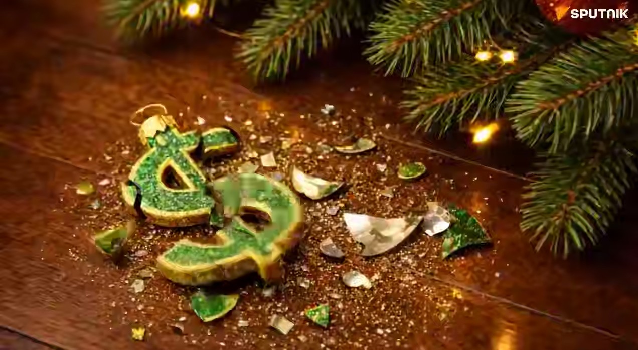 Görüntülerde, Amerikan finansal gücünü temsil eden yeşil bir dolar sembolünün yerde parçalandığı görülürken, yılbaşı ağacında Çin Yuanı (¥) ve Rus Rublesi (₽) sembollerinin yan yana ve parlayarak asılması dikkat çekiyor.