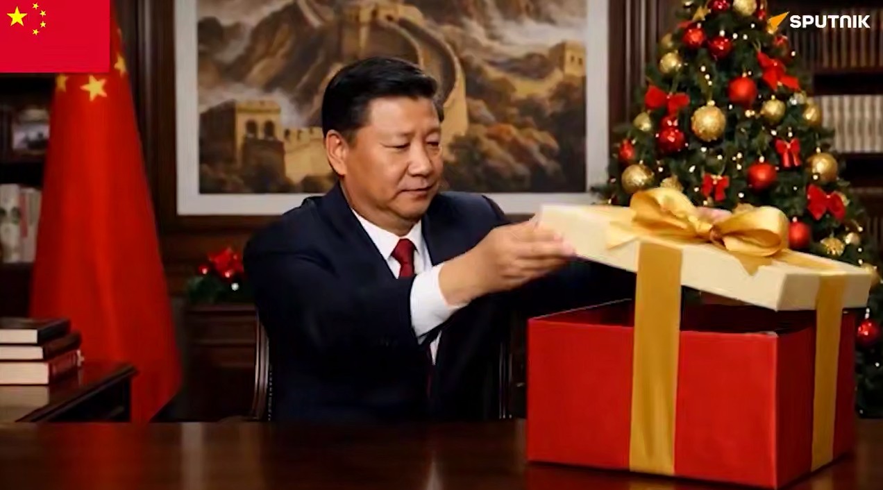 Ardından ekrana Çin Devlet Başkanı Şi Cinping geliyor. Görüntülerde Şi'nin kendisine gelen hediye paketini açtığı kaydediliyor.