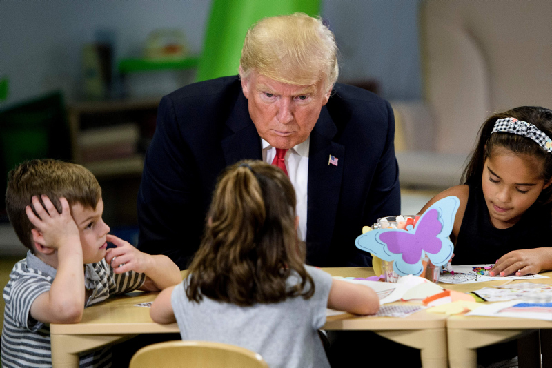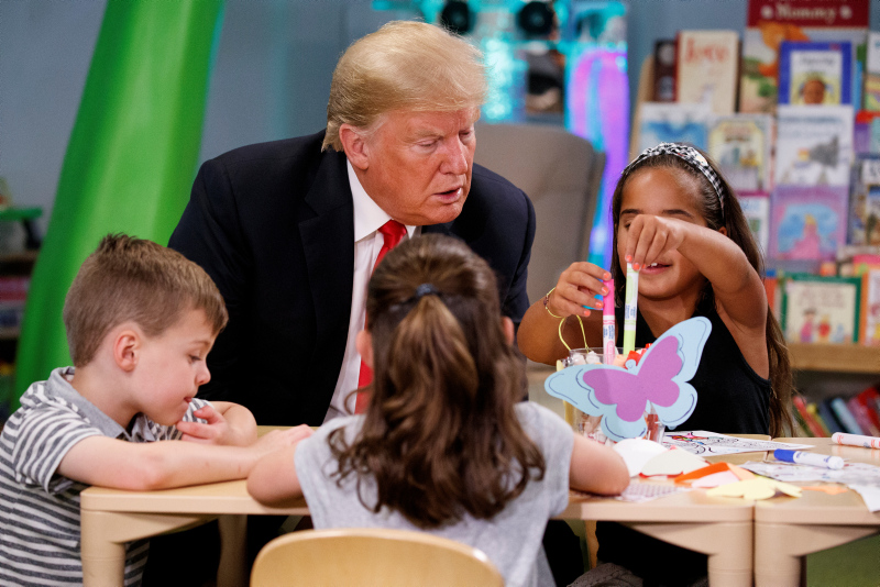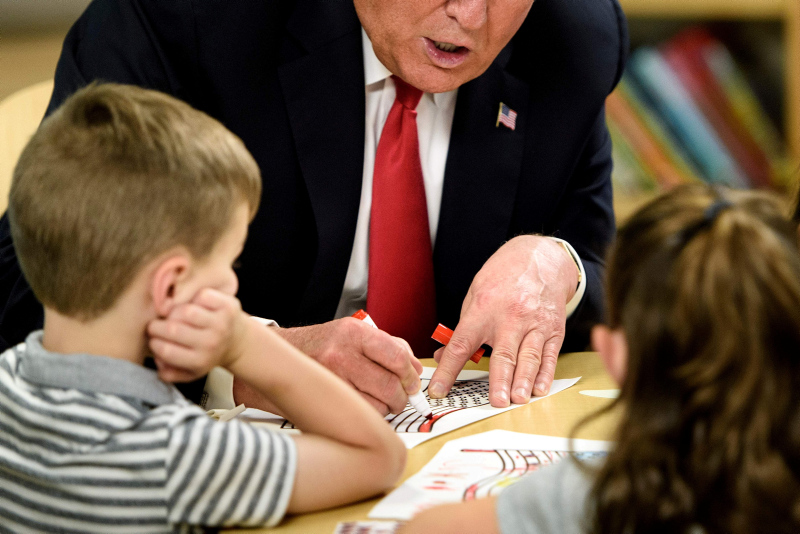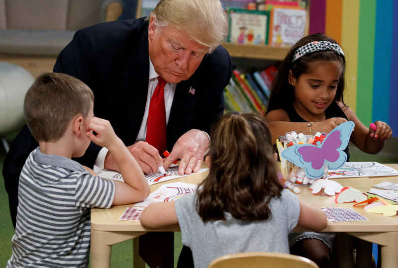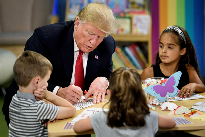 Trump gazetecilere fotoğraf vermek üzere çocuklarla bir masaya oturup Amerikan bayrağını boyalı kalemlerle renklendirmeye girişti.