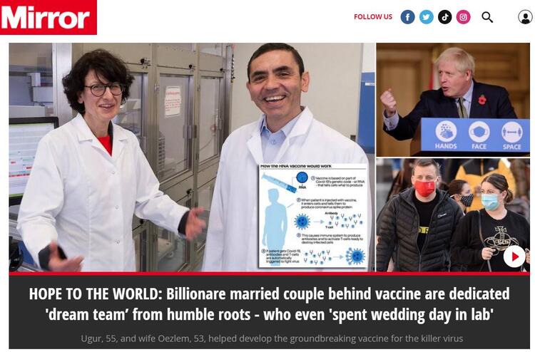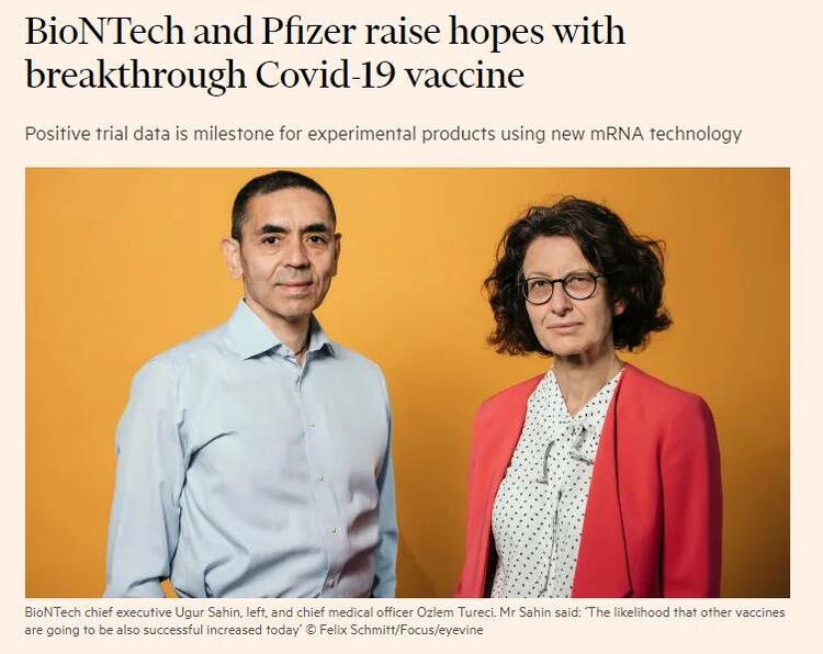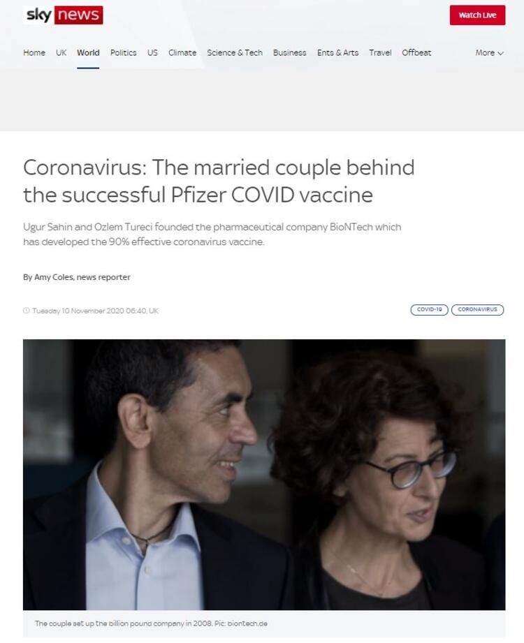 Koronavirüsle aşısında başarıya ulaştığını açıklayan ilk şirketin arkasında Türkiye kökenli iki bilim insanı var. ABD merkezli Pfizer ile birlikte geliştirdikleri koronavirüs aşısında yüzde 90 başarıya ulaştıklarını açıklayan Almanya merkezli BioNTech şirketi, aileleri Türkiye'den Almanya'ya göçmüş Özlem Türeci ve Uğur Şahin tarafından 2008'de kuruldu.