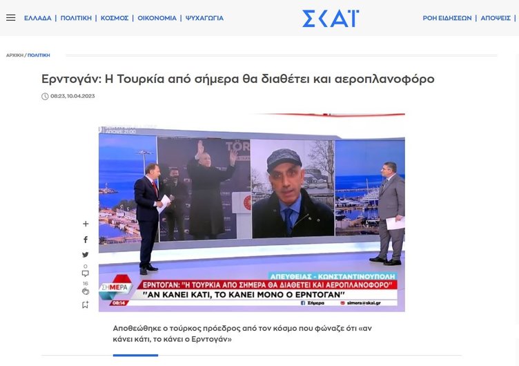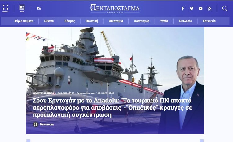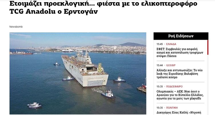 Yunan basını Türkiye'nin en büyük askeri gemisi TCG Anadolu'yu gündemine taşıdı. Türk filosunun artık k insansız hava araçları, taarruz helikopterleri, tanklar, zırhlı amfibi araçlar taşıyacak ve çıkarma operasyonları gerçekleştirebilecek bir uçak gemisine sahip olduğunu okuyucularına duyurdular...