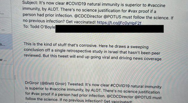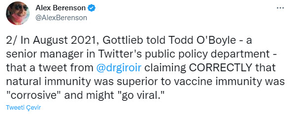 Berenson, Gottlieb tarafından Twitter yöneticisi Todd O'Boyle'a, Trump yönetimi yetkilisi Dr. Brett Giroir'in Twitter'daki, "Artık Kovid-19 doğal bağışıklığının aşı bağışıklığından üstün olduğu açık. Bir kişi önceden enfeksiyon geçirmişse artık aşı kanıtı için bilimsel bir gerekçe yoktur." ifadelerinden duyduğu rahatsızlığı dile getiren Ağustos 2021 tarihli e-postanın ekran görüntüsünü paylaştı.
