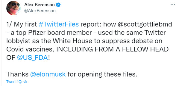 Elon Musk, "Twitter Dosyaları" ismiyle sürdürdüğü ifşaatın 12'incisini, Kovid-19 aşılarıyla ilgili eleştirel görüşler paylaşan gazeteci Alex Berenson aracılığıyla yaparken, gazetecinin twitini, "Bazı komplo teorileri aslında doğrudur." diyerek paylaştı.