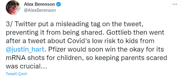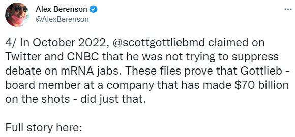 Araştırmacı gazeteci Berenson, kendi internet sitesinde de rapor olarak paylaştığı dosyada, 2022 sonuna kadar ABD Alerji ve Bulaşıcı Hastalıklar Enstitüsü (NIAID) Direktörü olarak görev yapan Dr. Anthony Fauci'yi eleştiren twitinin Gottlieb tarafından hedef alındığına da değindi.