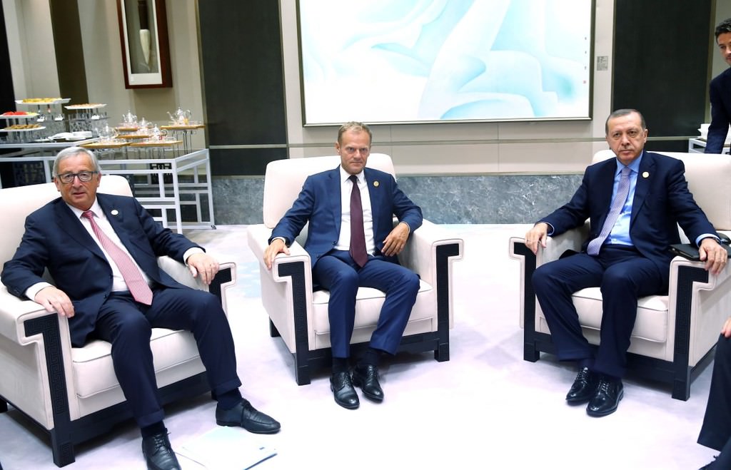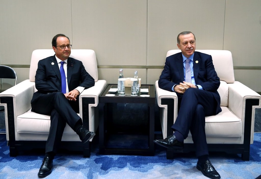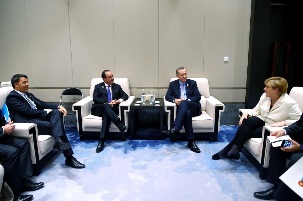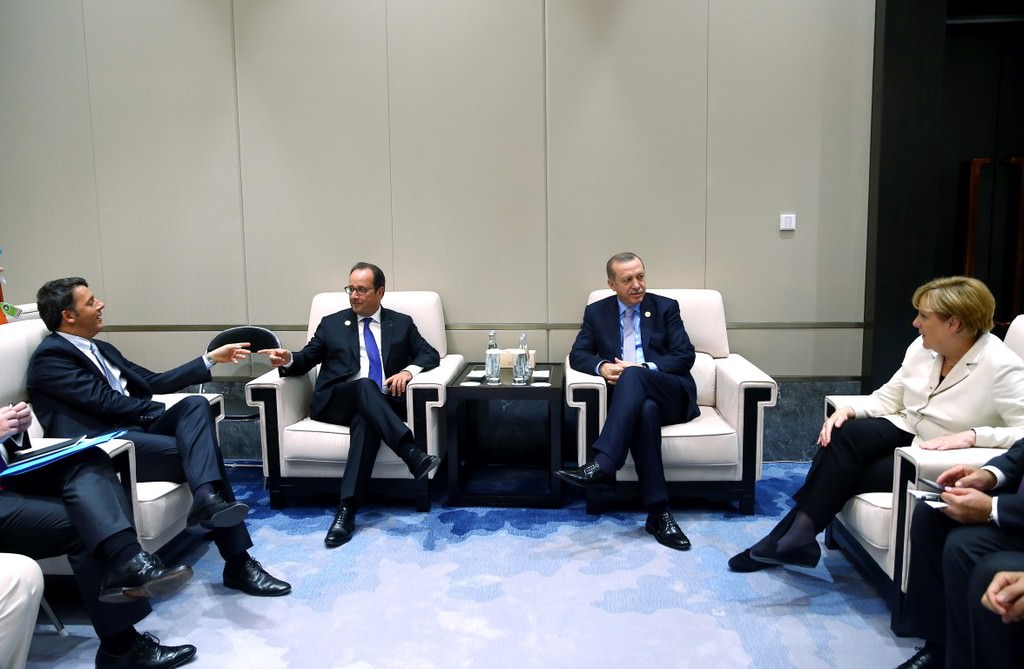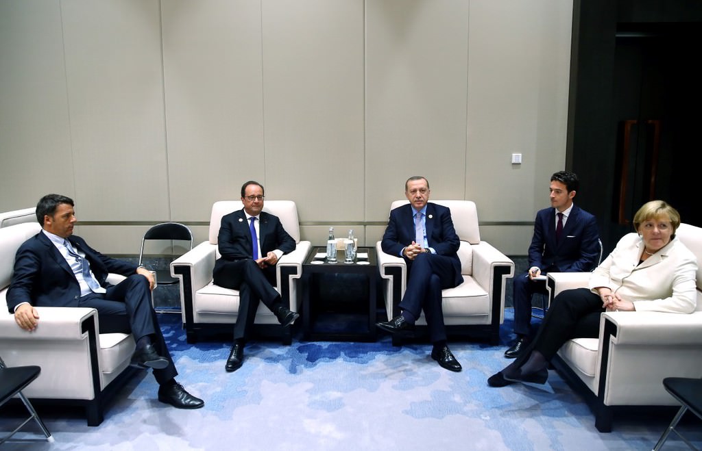 Erdoğan, G20 Liderler Zirvesi için bulunduğu Çin Halk Cumhuriyeti'nin Hangcou kentinde Fransa Cumhurbaşkanı Hollande, Almanya Başbakanı Merkel, İtalya Başbakanı Renzi ile bir araya geldi.