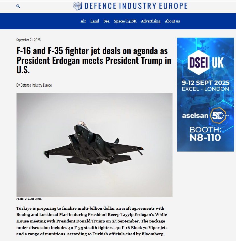 Defence Industry Europe, Türkiye'nin Boeing ve Lockheed Martin ile milyarlarca dolarlık uçak anlaşmalarını sonuçlandırmak üzere olduğunu bildirdi. Bloomberg'e dayandırılan haberde, görüşülen paketin 40 F-35, 40 F-16 Block 70 ve çeşitli mühimmatları içerdiği kaydedildi. THY'nin 250'ye yakın Boeing uçağı için yürüttüğü görüşmelere de değinildi.