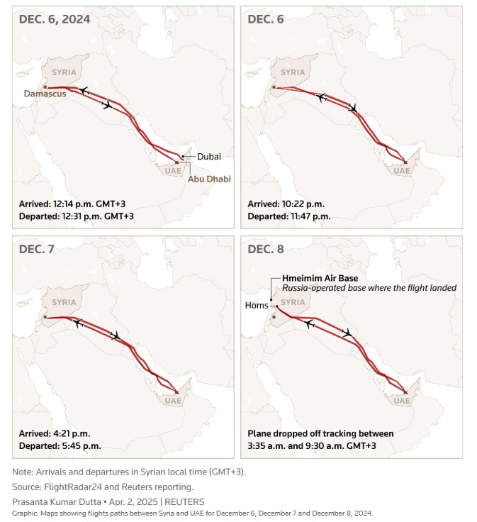 Reuters'ın uçuş kayıtlarını incelemesi sonucunda, Gambiya'ya kayıtlı C5-SKY kuyruk numaralı Embraer Legacy 600 tipi özel jetin, rejimin çöküşünden önceki 48 saat içinde Suriye'ye dört kez gidip geldiği ortaya çıktı. Dördüncü ve son uçuş, Rusya'ya ait Hmeymim Askeri Üssü'nden 8 Aralık günü gerçekleşti. Esad da aynı gün, aynı üsten Rusya'ya kaçtı.