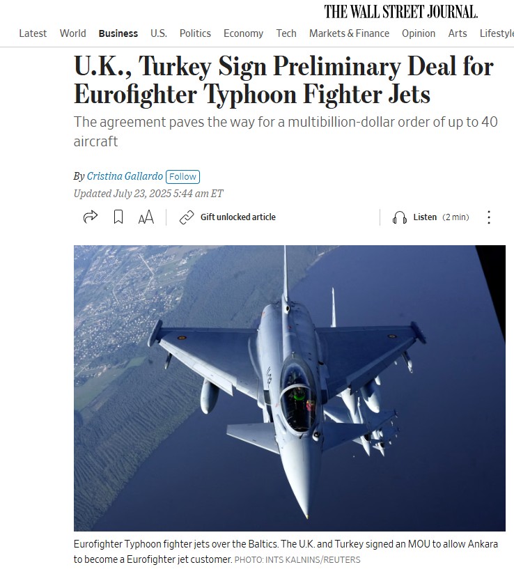 Türkiye'nin Almanya gerçekleştirdiği 40 adet Eurofighter anlaşmasına ilişkin ön onay verilmesi, ardından İngiltere ile imzalanan tam kapsamlı mutabakat dünya basınında geniş yankı uyandırdı. Yunanistan ve Batı medyasının yanı sıra siyonist basın da gelişmeyi yakın kadraja aldı.