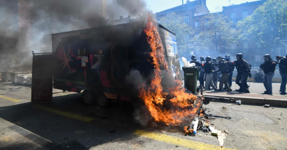 Toulouse'da gösteri yasağına rağmen sokağa çıkan eylemciler, iş aracını ateşe verdi. Polisin biber gazı kullandığı gösteride 23 kişi gözaltına alındı ve 2 kişi ağır yaralandı.