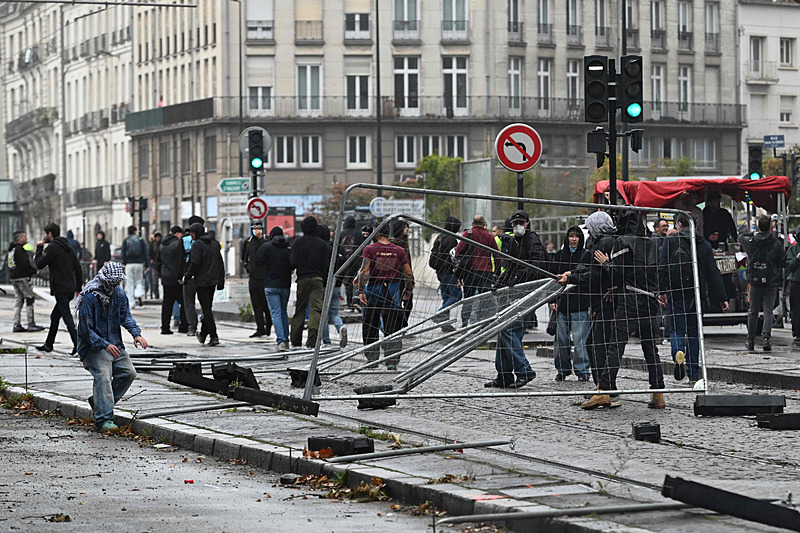 Nantes'ta göstericiler yolu yanan lastikler ve çöp kutularıyla kapattı; Rennes'te bir otobüs ateşe verildi.