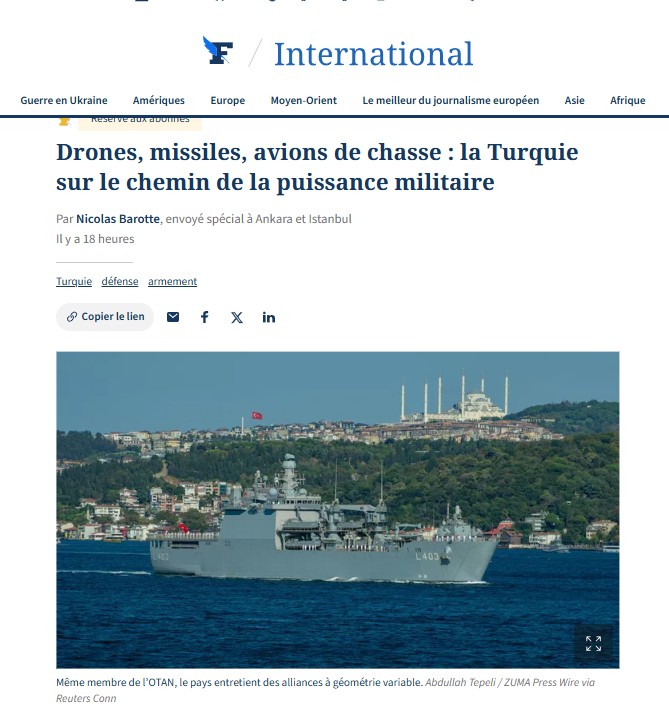 Fransız Le Figaro gazetesi Türkiye'nin ürettiği insansız hava araçları (İHA), füzeler ve savaş uçaklarıyla askeri güce dönüşme yolunda olduğunu belirtti.