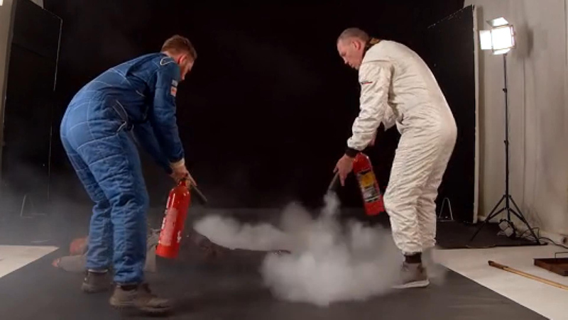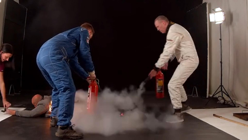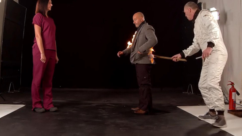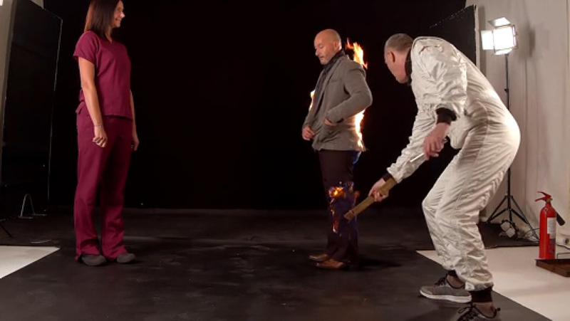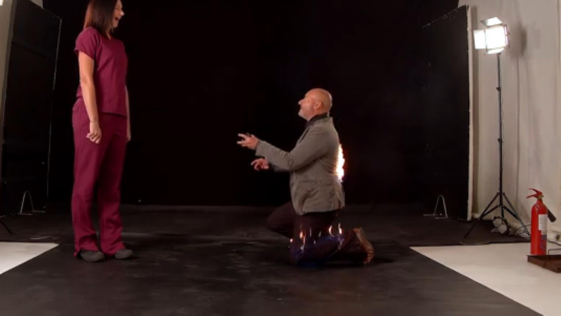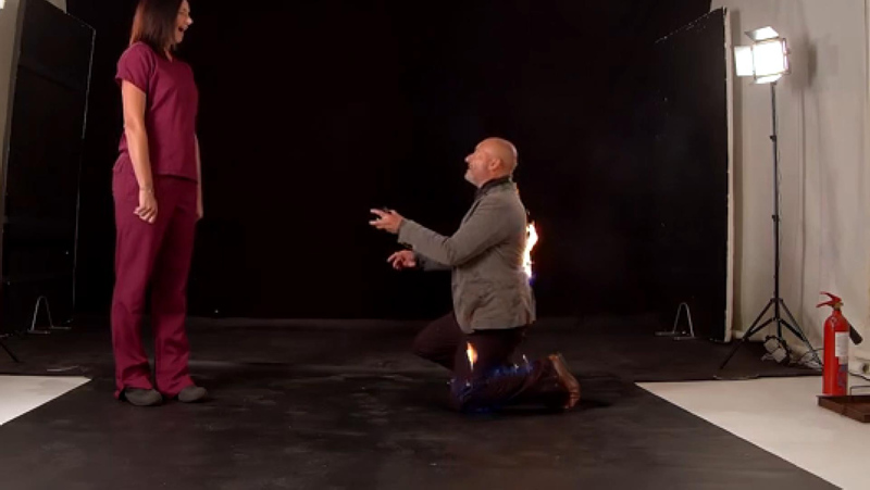 Evlenme teklifi sırasında filmlerde kullanılan zararsız alevle kendisini yakan Ash'in ceketinden ve pantolondan alevler çıkarken, duygu dolu dakikalar yerini gerilime bıraktı.