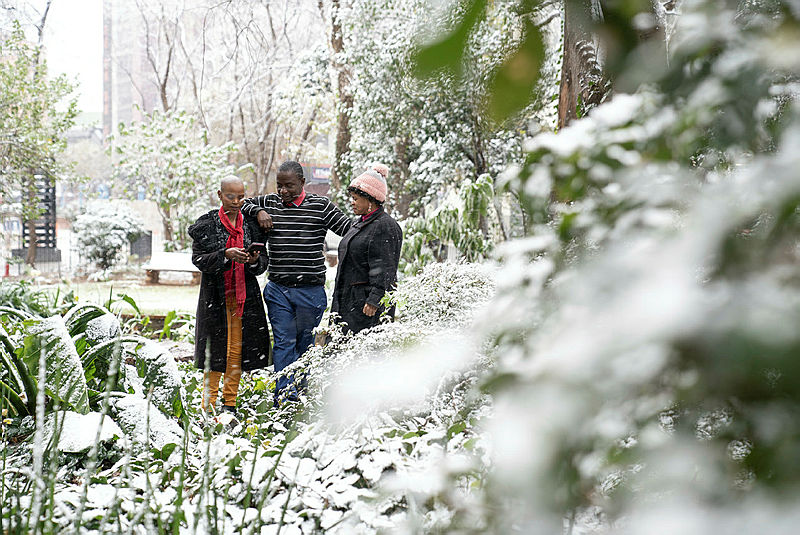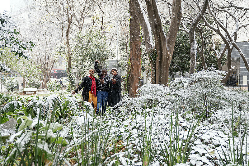 2012 yılından bu yana ilk kez kar yağışı görülen Johannesburg'da halk bahçelere akın etti.