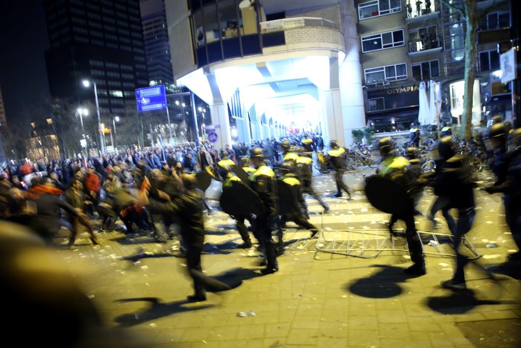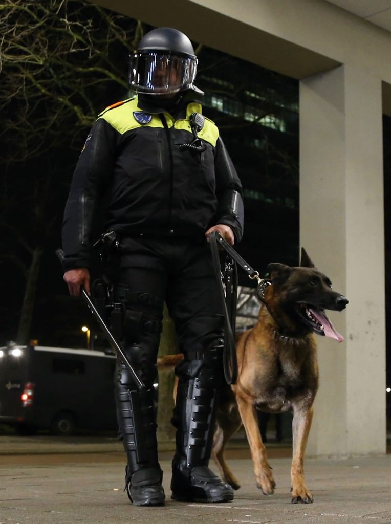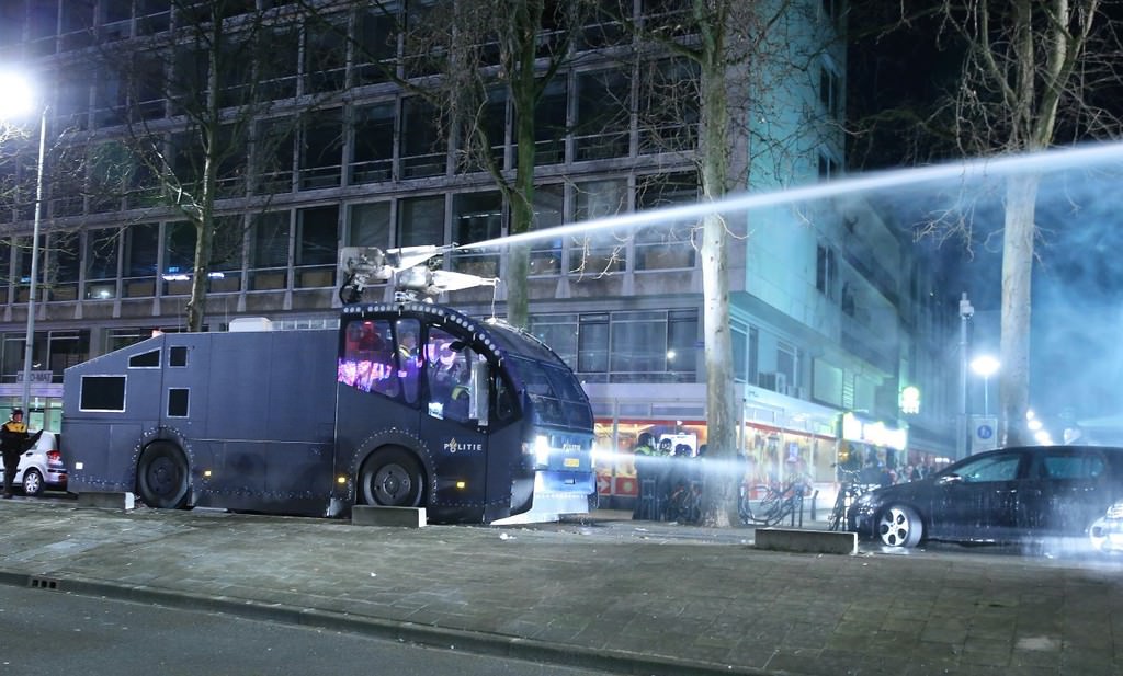 Hollanda hükümetinin engellemelerine karşı Bakan Kaya'ya destek vermek için bölgede bulunan Türk vatandaşlarının üzerine TOMA araçlarıyla tazyikli su sıkılan müdahalede, çok sayıda polis köpeği kullanıldı.
