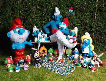 Stephen Parkes ve dünyanın en büyük 'Şirinler' koleksiyonuyla poz veriyor. Koleksiyon tam bin 61 parça.