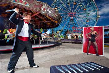 Guinness Rekorlar Kitabı'na bıçak atmada kırdığı rekorlarla giren Adamovich asistanının orta yerinde durduğu, birkaç