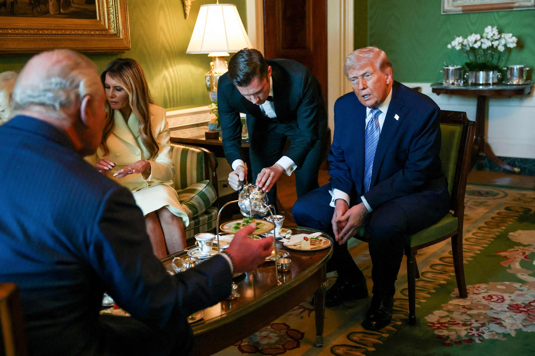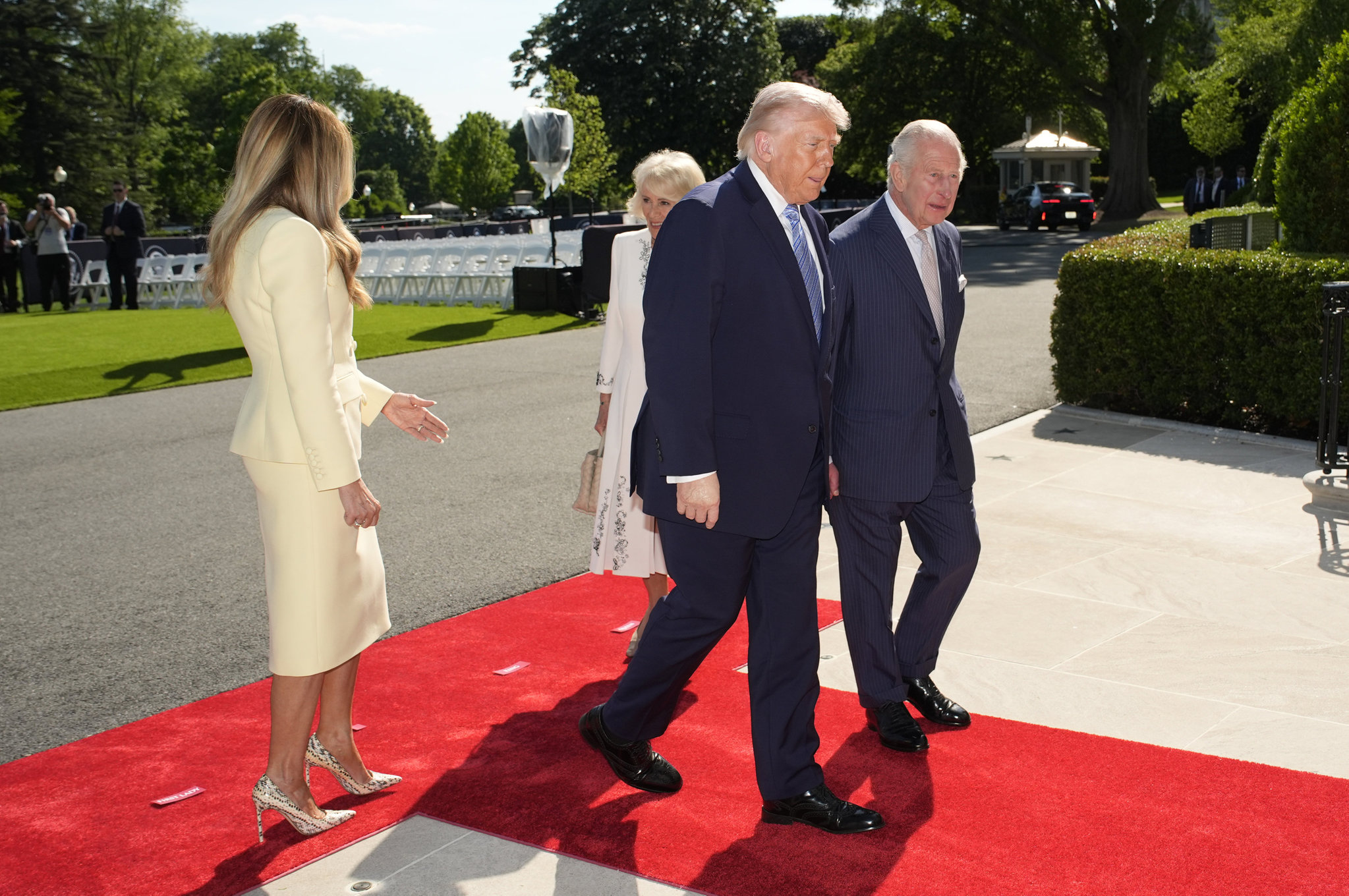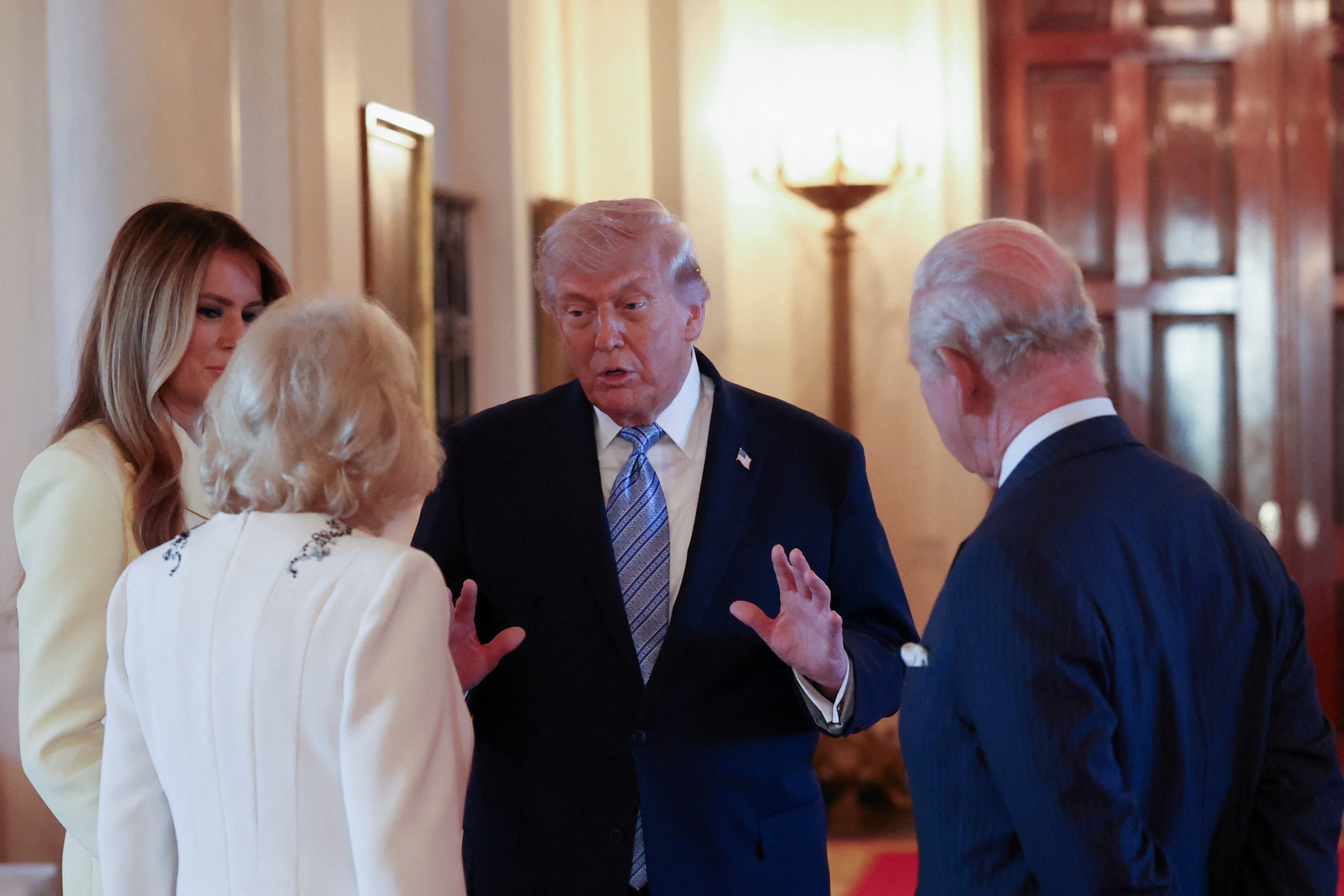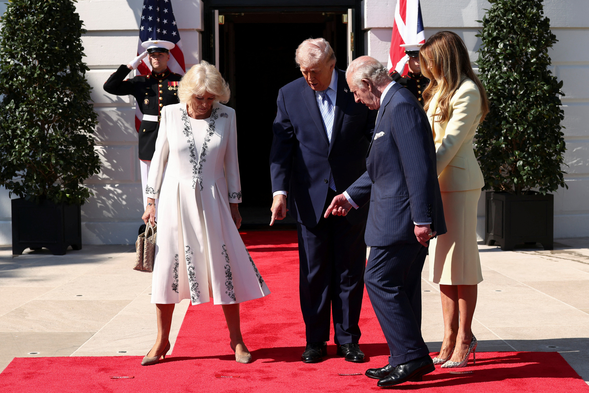 Trump ve eşi Melania Trump, Kral Charles ile Kraliçe Camilla'yı Beyaz Saray'ın Güney Bahçesi'nde karşıladı. Televizyon kameraları bu anları görüntülese de, ikili arasında geçen kısa konuşma duyulmadı.