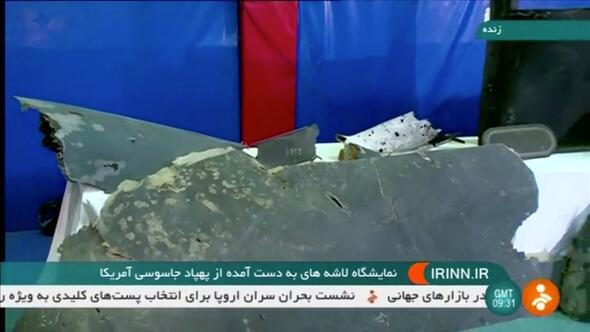 Devrim Muhafızları Ordusu tarafından başkent Tahran'da düzenlenen basın toplantısında dün Hürmüz Boğazı üzerinde düşürülen ABD'ye ait RQ-4 Global Hawk tipi yüksek irtifa İHA'nın enkazı gösterildi.