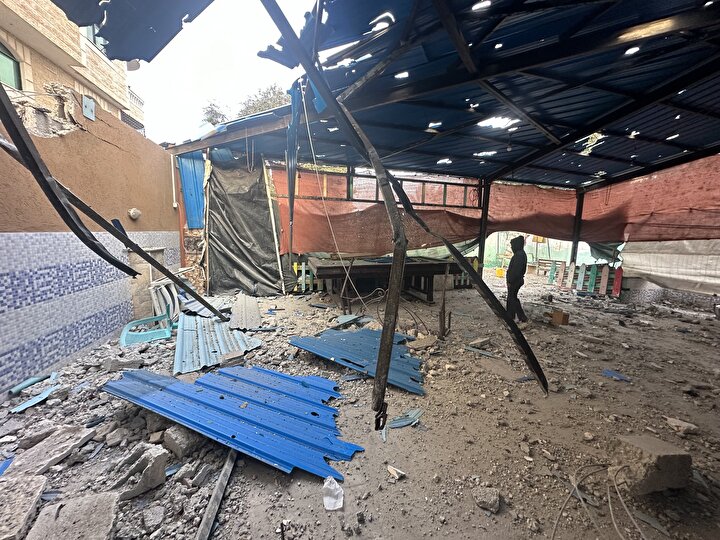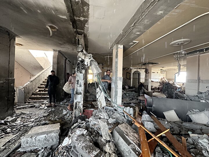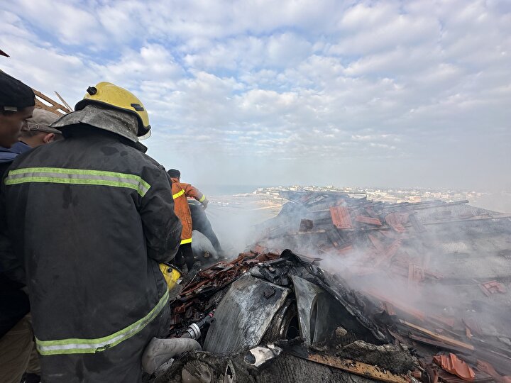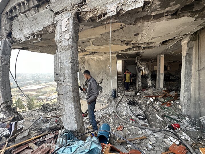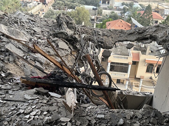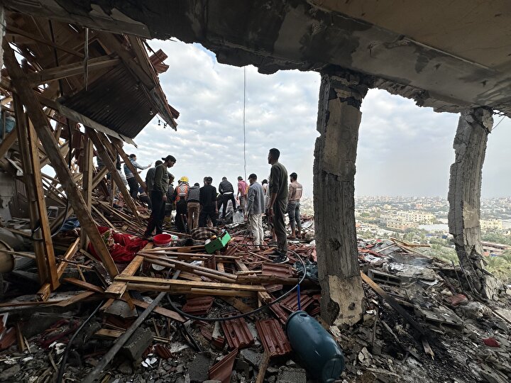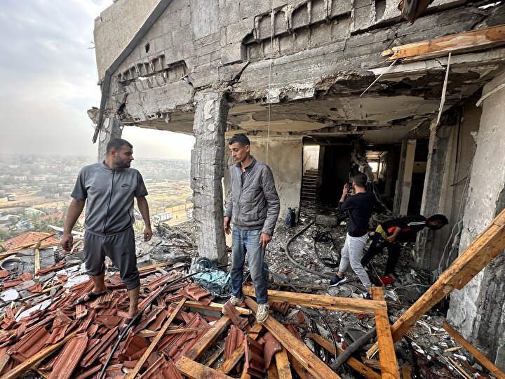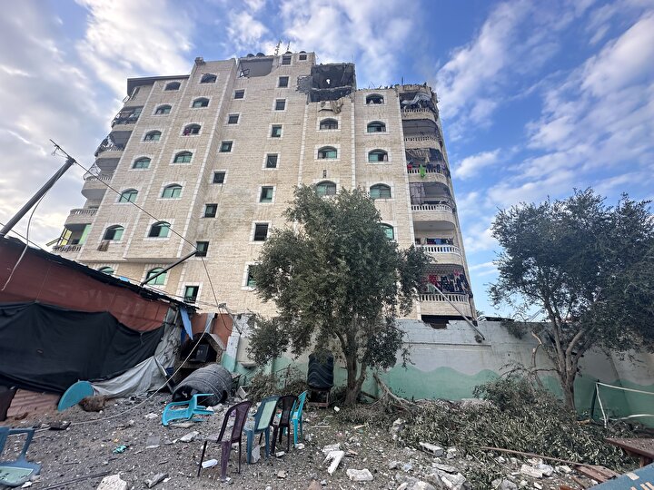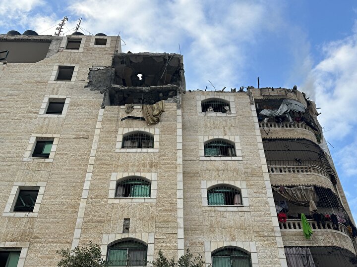 İsrail'in Gazze Şeridi'nin orta kesimindeki Nuseyrat Mülteci Kampı'na düzenlediği saldırıda, Burc Muştihi binası ağır hasar gördü.