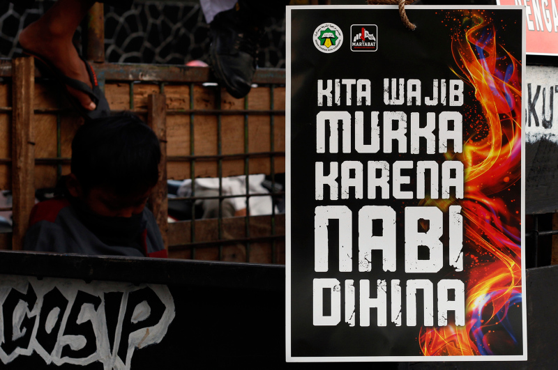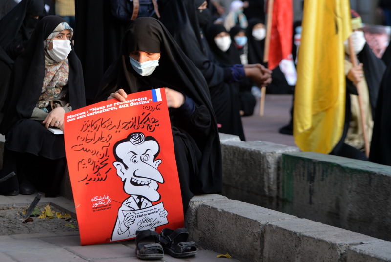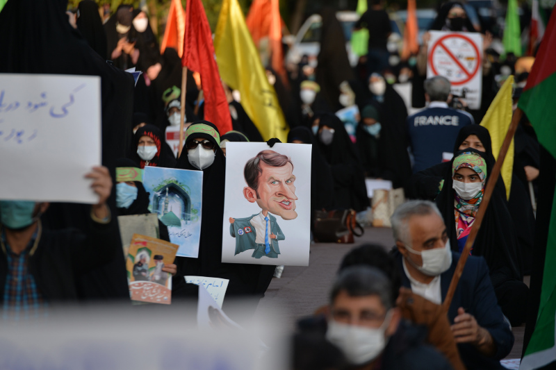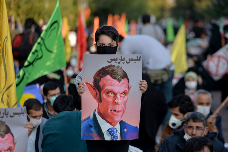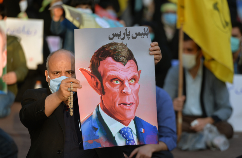 İran'ın başkenti Tahran'daki protestocular ise Macron'u 'şeytan' şeklinde gösteren pankartlar taşıdı, Fransız liderin fotoğraflarını ateşe verdi.