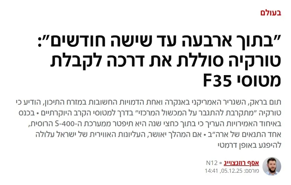 İsrail basını, Ankara'nın F-35 programına yeniden dahil olmasının an meselesi olduğunu yazdı. Washington'dan gelecek nihai adımın, İsrail'in yıllardır koruduğu hava ve teknoloji üstünlüğünü zayıflatabileceği belirtilirken, Tel Aviv yönetiminde "stratejik denge değişiyor" endişesi yükseliyor.