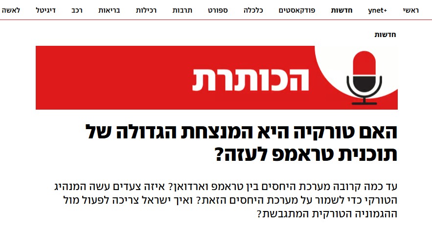 İsrail'in önde gelen gazetesi Yedioth Ahronoth'ta yayımlanan "Manşet" adlı podcast programında, Türkiye'nin bölgede artan etkisi ve Başkan Recep Tayyip Erdoğan'ın "yeni güç dengesi kurma hamleleri" masaya yatırıldı.
