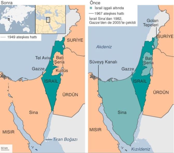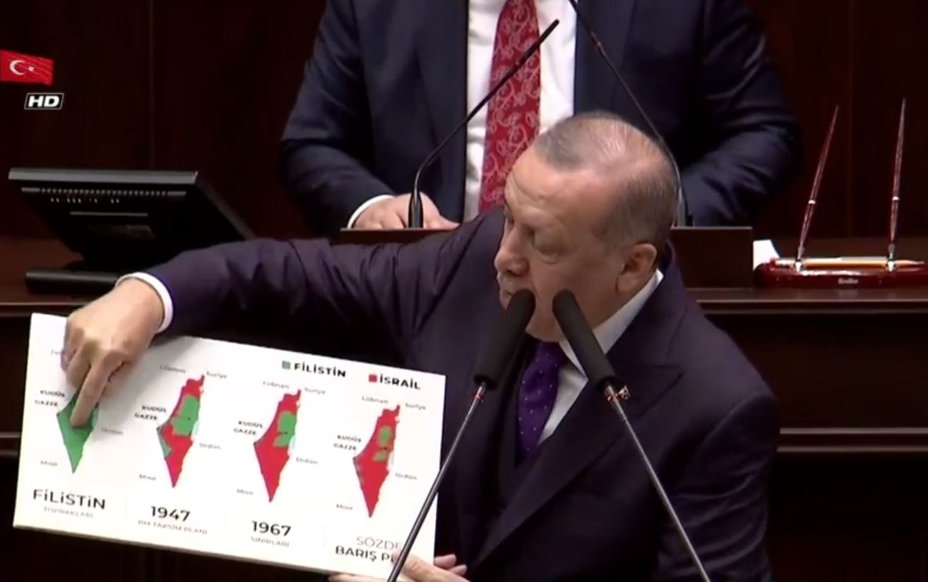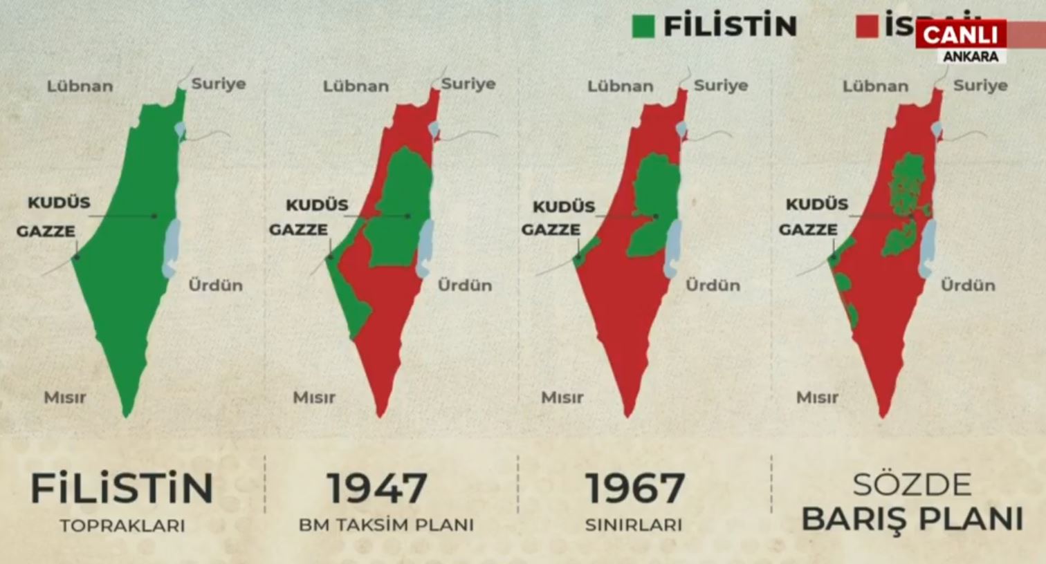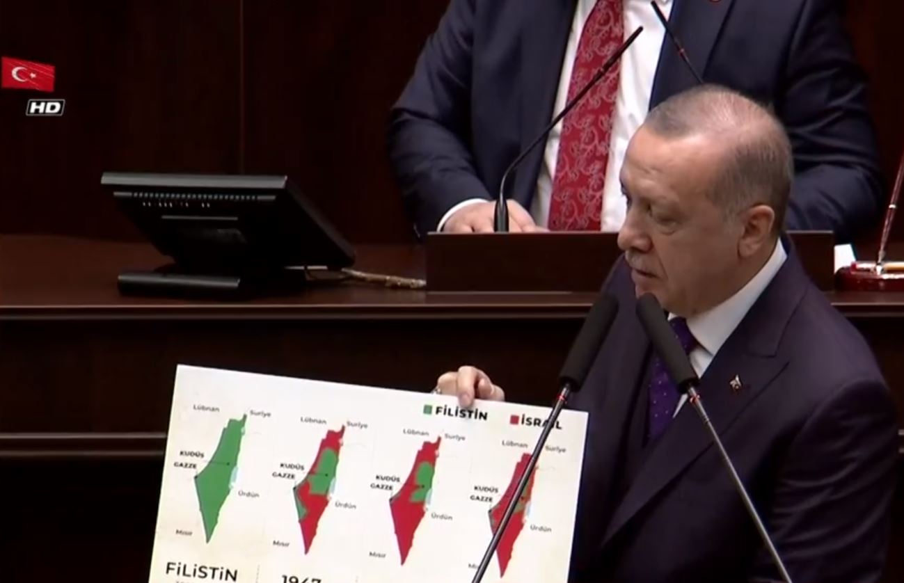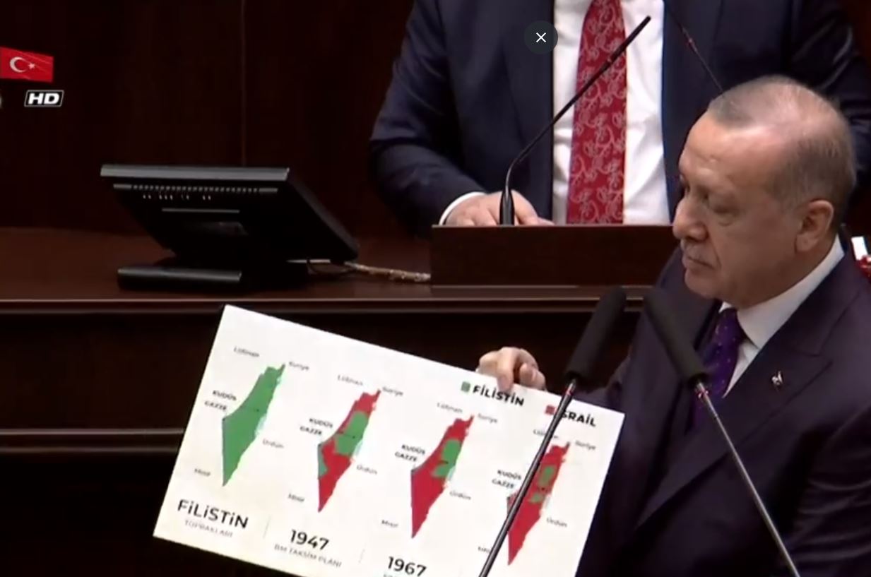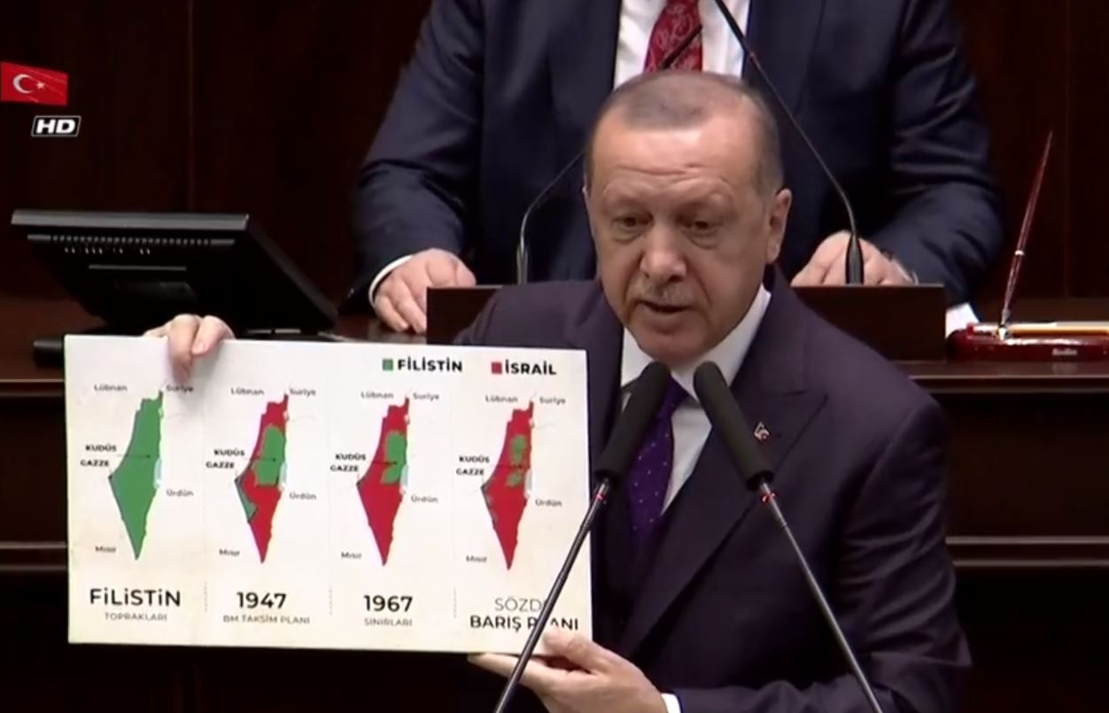 14 Mayıs 1948'de bağımsızlığını ilan eden İsrail kuruluşundan günümüze kadar Filistin topraklarını gasp ederek kendi toprağı ilan ediyor. Filistin topraklarında üç beş karış toprakla başlayan kanlı işgal hala devam ediyor. İsrail'in kuruluşundan bu güne haritadaki değişimini Başkan Erdoğan AK Parti Grup Toplantısı'nda göstererek "ABD yönetiminin geçen hafta açıkladığı plan bir barış değil işgal ve ilhak planıdır. Bu plan İsrail'in yıkım ve gasp politikalarına meşrutiyet kazandırmaktır. Şu anda yapılmak istenen 1947 yılından önceki Filistin topraklarının bu halini şimdi İsrail toprağı haline getirmek istiyor. Filistin'in işgaliyle ilgili haritayı ezberleyelim ezberletelim" dedi. BAŞKAN ERDOĞAN: BU HARİTAYI EZBERLEYELİM