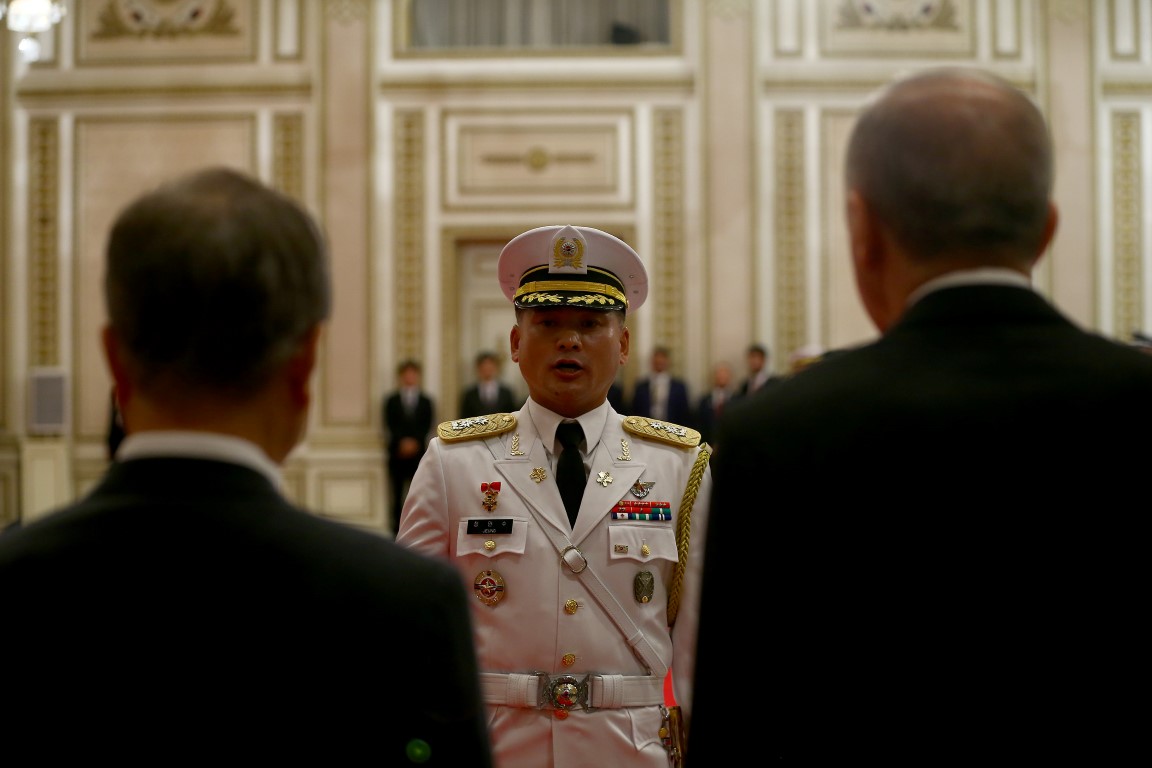Erdoğan ile Moon tören kıtasını selamladıktan sonra, eşleriyle beraber tören alanındaki yerlerini almalarının ardından Türkiye ve Güney Kore milli marşları çalındı.