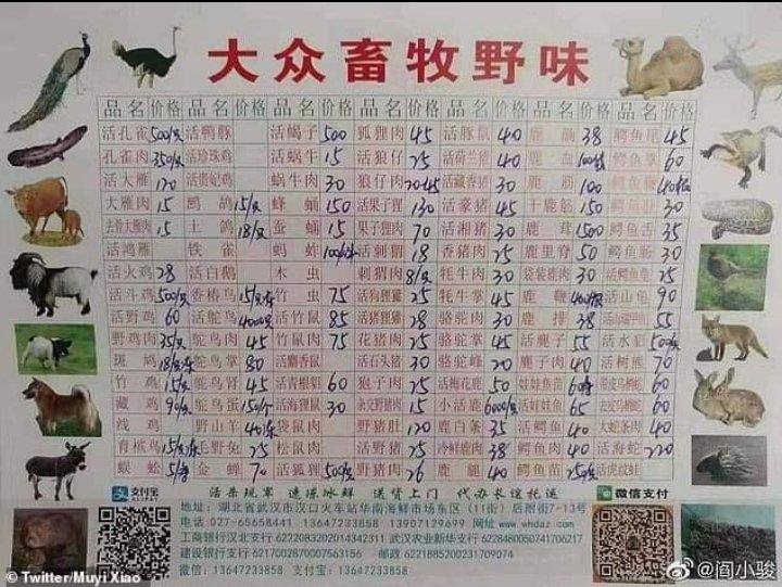 Bu pazarda yarasa, yılan, koala, yavru kurt, timsah, tilki, tavuskuşu gibi yabani hayvanlar yenilmek için canlı canlı veya ölü olarak satılıyor.