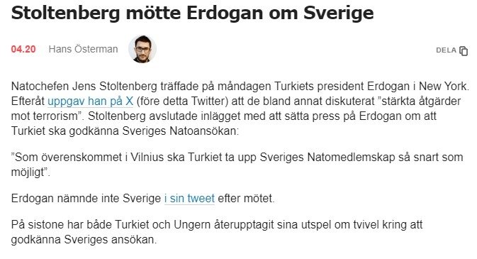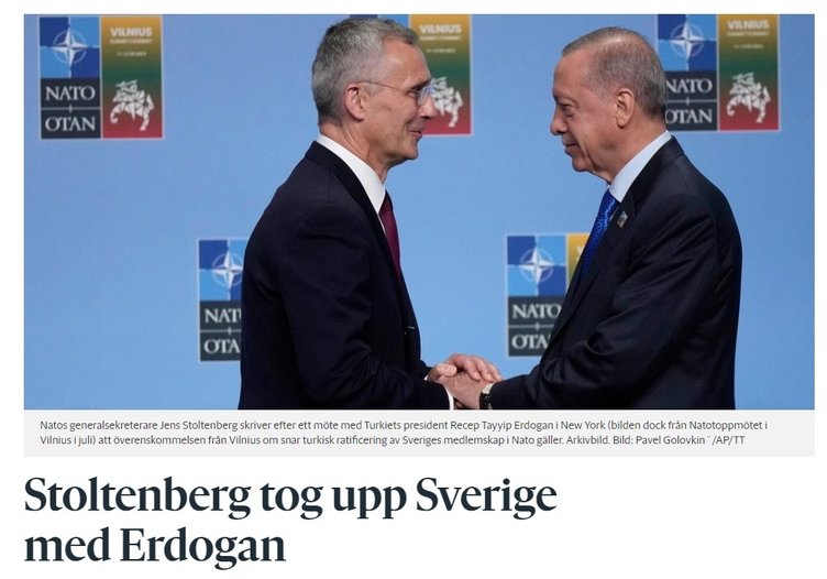 Başkan Erdoğan'ın NATO Genel Sekreteri Jens Stoltenberg ile yaptığı görüşme İsveç medyasının gündemine oturdu. "NATO süreci nasıl olacak?" diye soran İsveç basını görüşme sonrası Stoltenberg'in görüşme detaylarıyla ilgili yaptığı açıklamada İsveç'ten bahsettiğine; ancak Erdoğan'ın bahsetmediğine dikkat çekti.