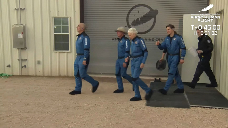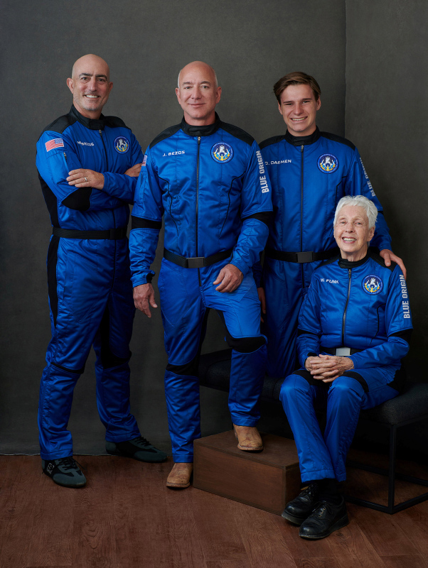 11 dakikalık uzay yolculuğunda Bezos'a, kardeşi Mark Bezos, 82 yaşındaki Wally Funk ve 18 yaşındaki Oliver Daemen eşlik ediyor.