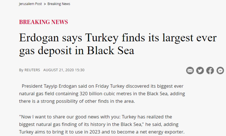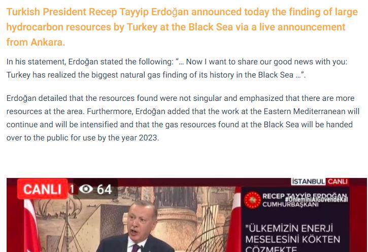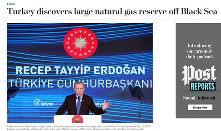 Amerika'da yayın yapan The Washington Post haberi 'Erdoğan Karadeniz'de çok büyük bir doğal gaz rezervi bulunduğunu açıkladı' şeklinde duyurdu.