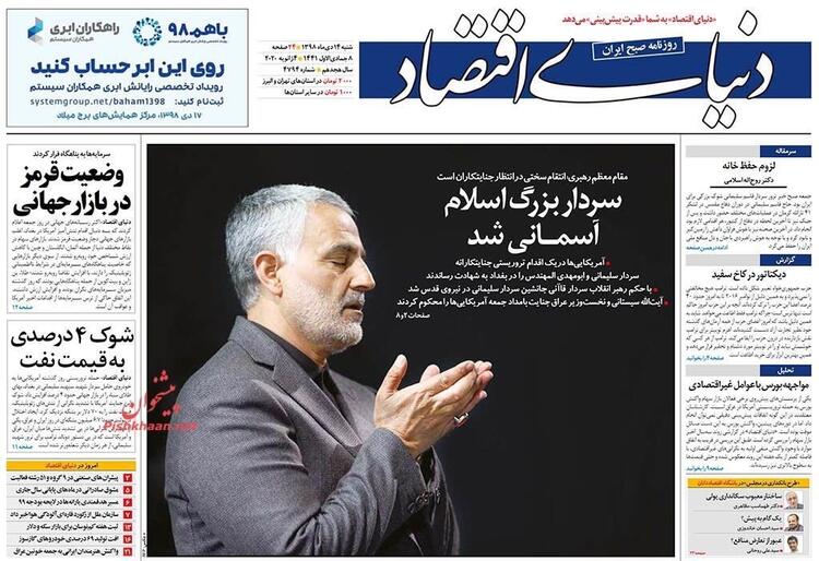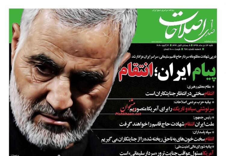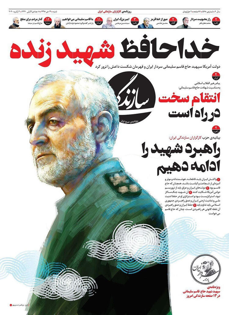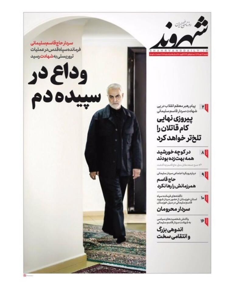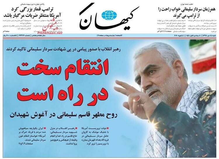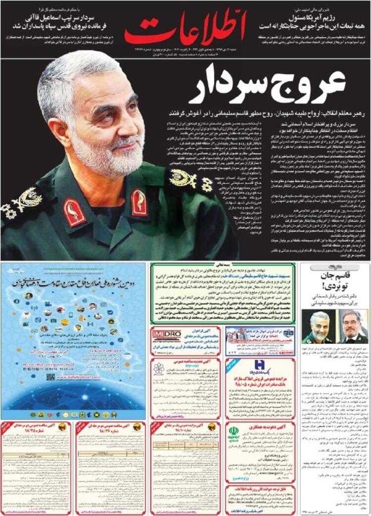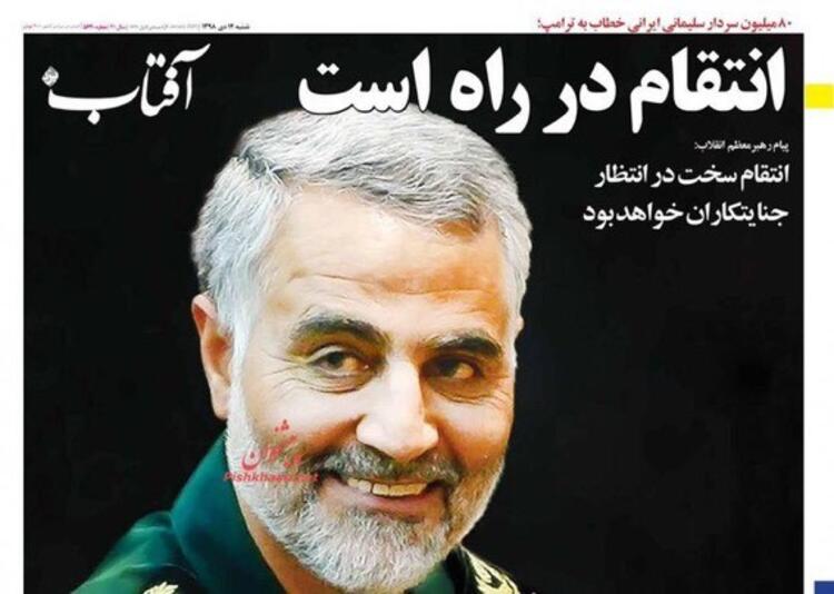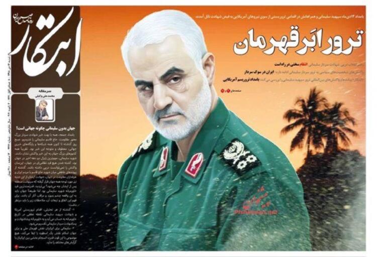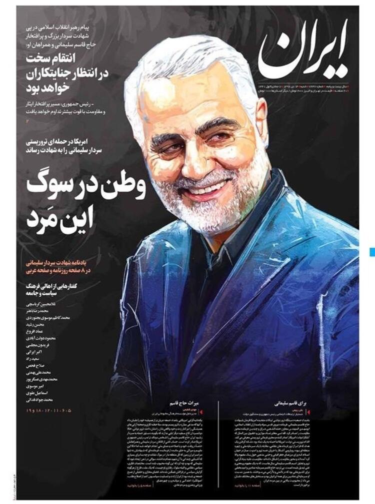 İran'ın Ortadoğu ve bütün sınır ötesi operasyonlarını yürüten Tümgeneral Kasım Süleymani'nin Irak'ta Amerika operasyonuyla öldürülmesine duyulan öfke bugün İran gazetelerinin manşetlerine de yansıdı. Manşetlerde intikam başlıkları dikkatlerden kaçmadı.