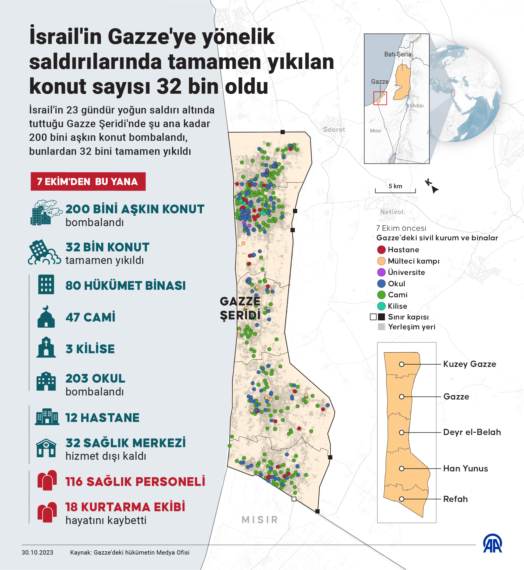 Katil İsrail, 24 gündür abluka altına aldığı Gazze Şeridi'ne şu ana kadar 200 bini aşkın konutu bombaladı. Terör devletinin bombaladığı binalardan 32 bini tamamen yıkıldı. Gazze'deki hükümetin Medya Ofisi Başkanı Selame Maruf, saldırılarda, 80 hükümet binasının, 47 caminin, 3 kilisenin ve 203 okulun bombalandığını, bunlardan 37'sinin hizmet dışı kaldığını söyledi.