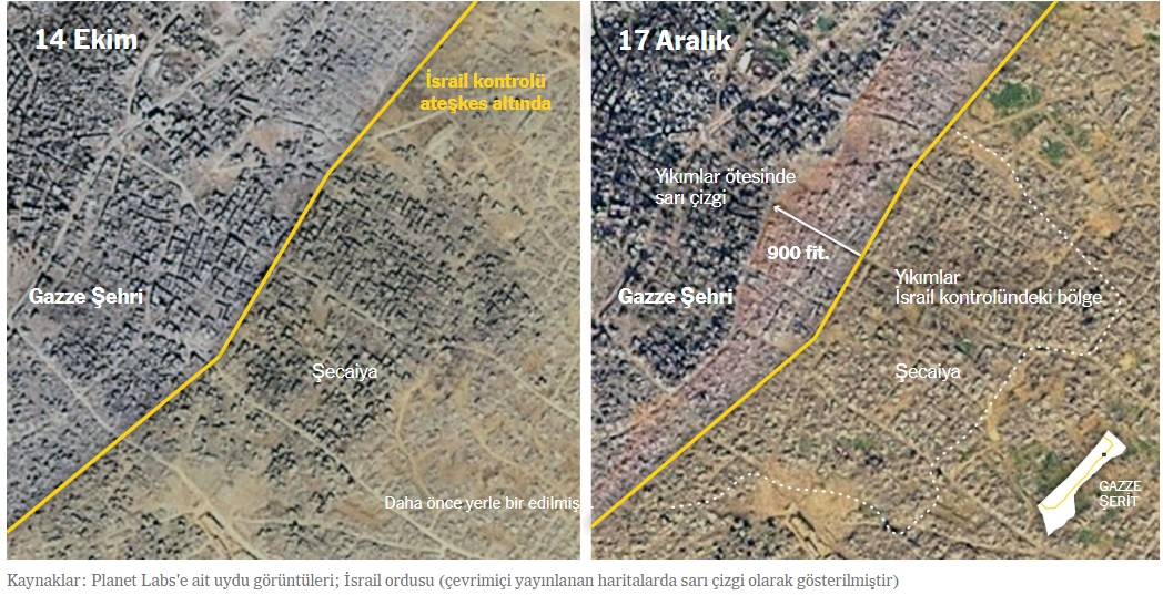 Ancak uydu görüntüleri, sarı çizginin ötesinde, fiilen Hamas kontrolü altındaki bölgelerde de düzinelerce binanın yok edildiğini ortaya koyuyor. Oysa İsrail işgal güçleri, bu alanlarda operasyonlarını durdurmayı kabul etmişti.