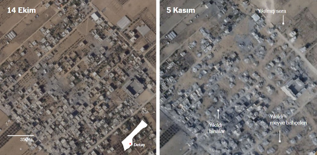 Ateşkesten kısa süre sonra çekilen uydu görüntülerinde, sarı çizgi boyunca uzanan Şucaiyye Mahallesi'nde sağlam yapı kümeleri net biçimde görülüyordu. Aylar sonra çekilen görüntüler ise bu bölgenin büyük ölçüde çorak bir araziye dönüştüğünü gösteriyor.