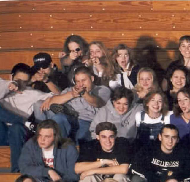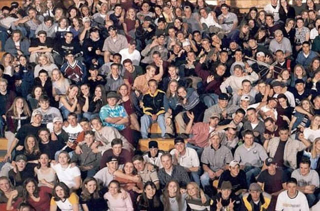 Sol üstteki gençler parmaklarını silah şekline getirip poz vermişler. Eric Harris ve Dylan Klebold adlı bu öğrenciler çekimden birkaç gün sonra okulu silahla basıp önlerine geleni öldürdüler.