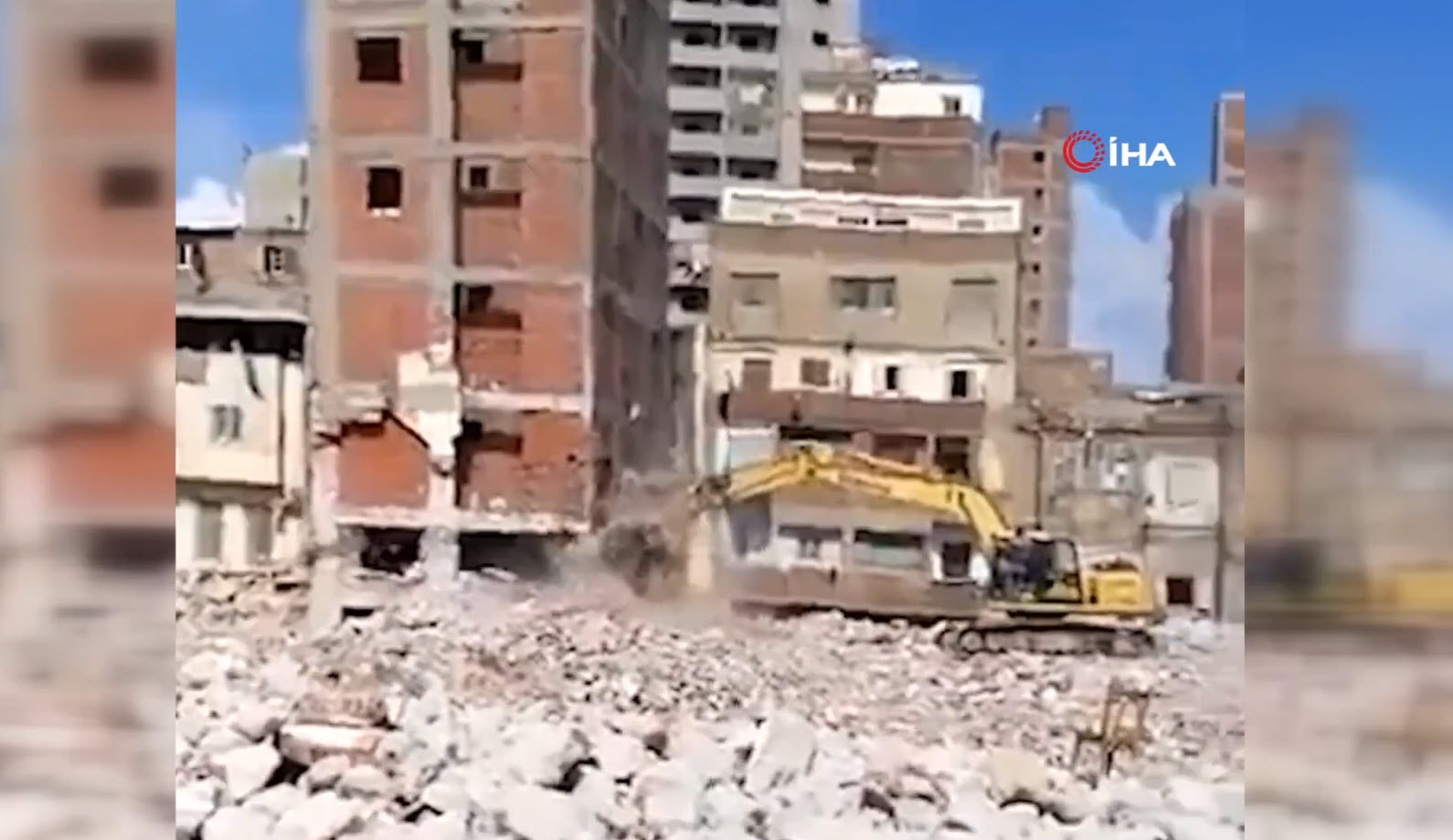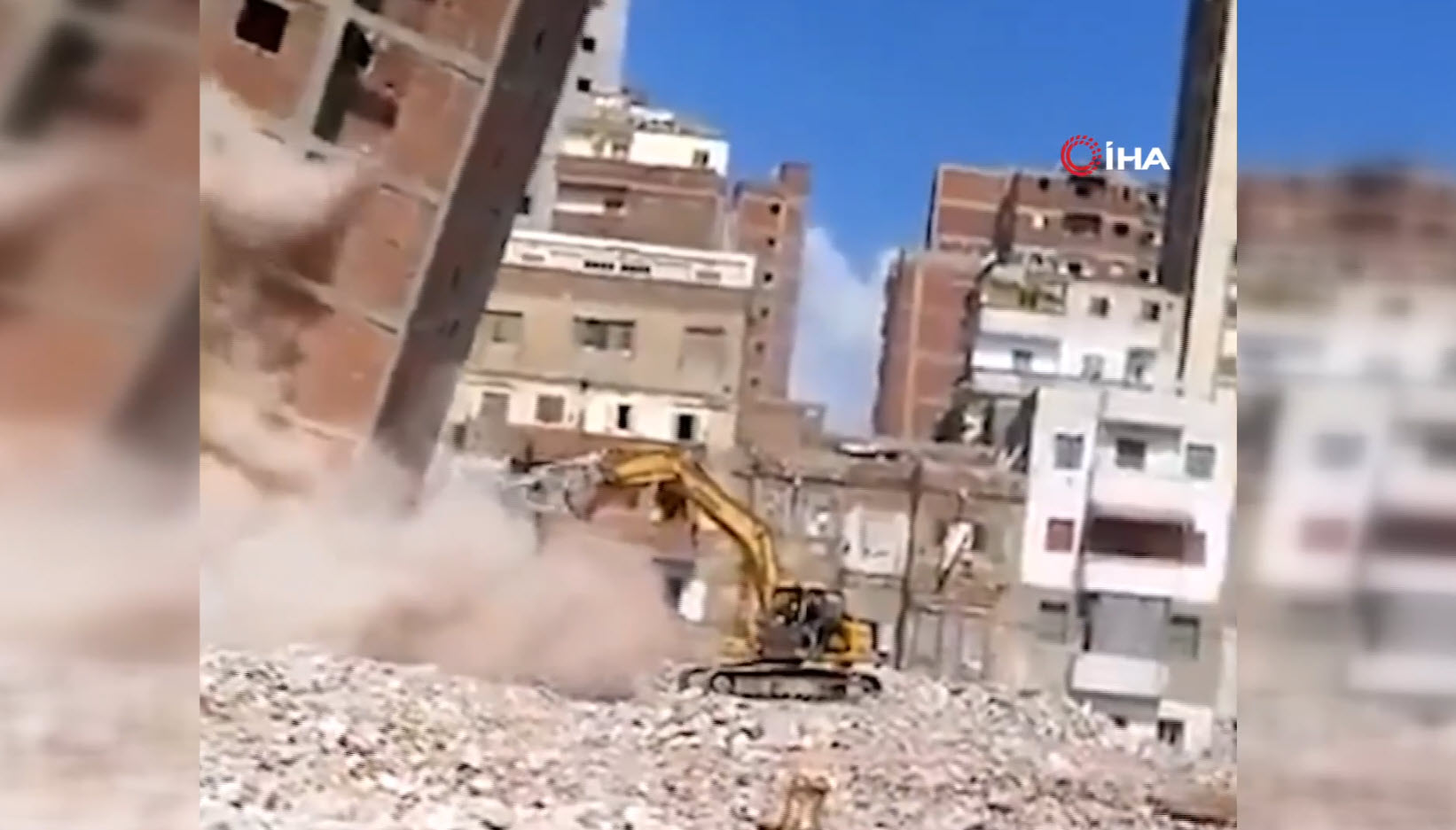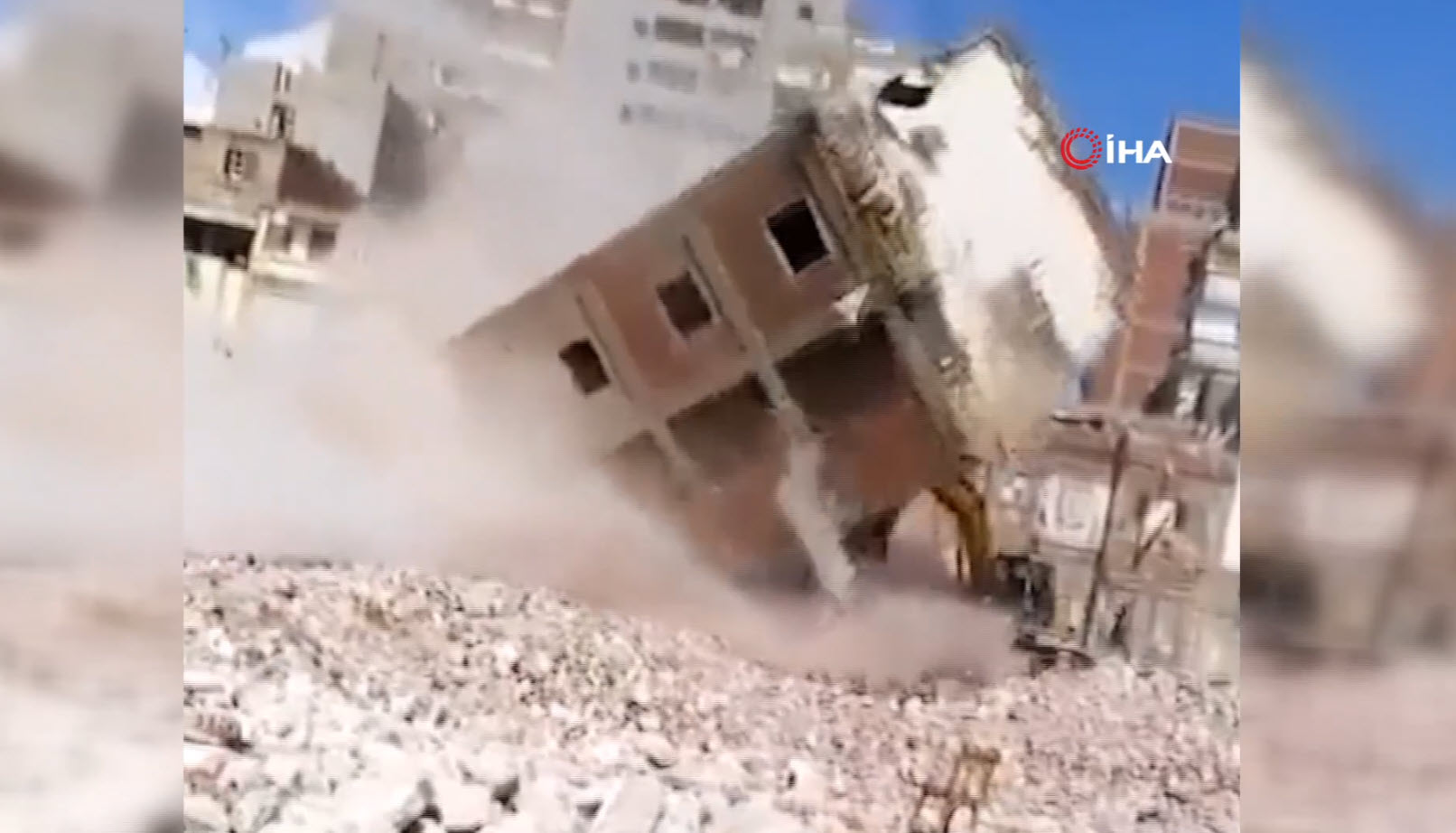 İş makinesinin binanın alt kolonunu yıkmasının ardından bina iş makinesinin üzerine devrildi.