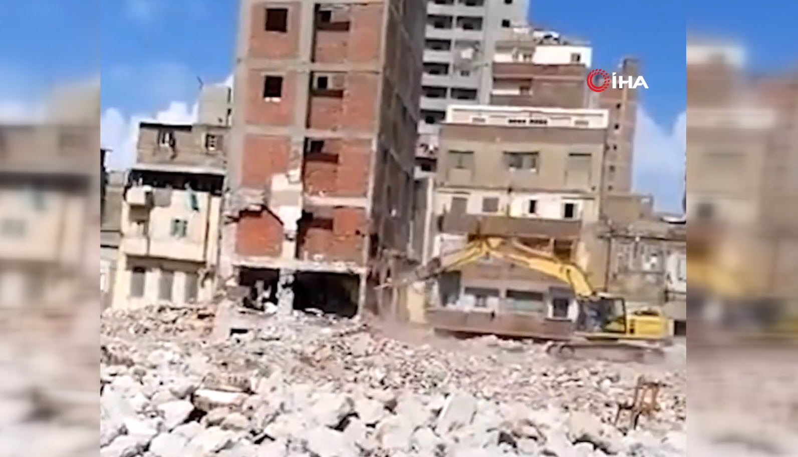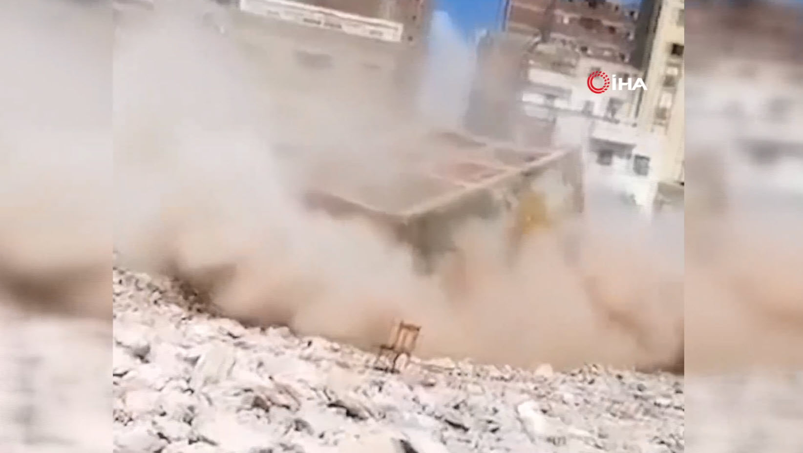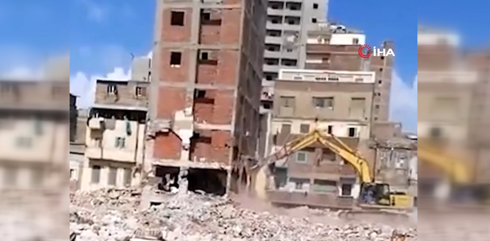 İş makinesinin binanın alt kolonunu yıkmasının ardından bina iş makinesinin üzerine devrildi.