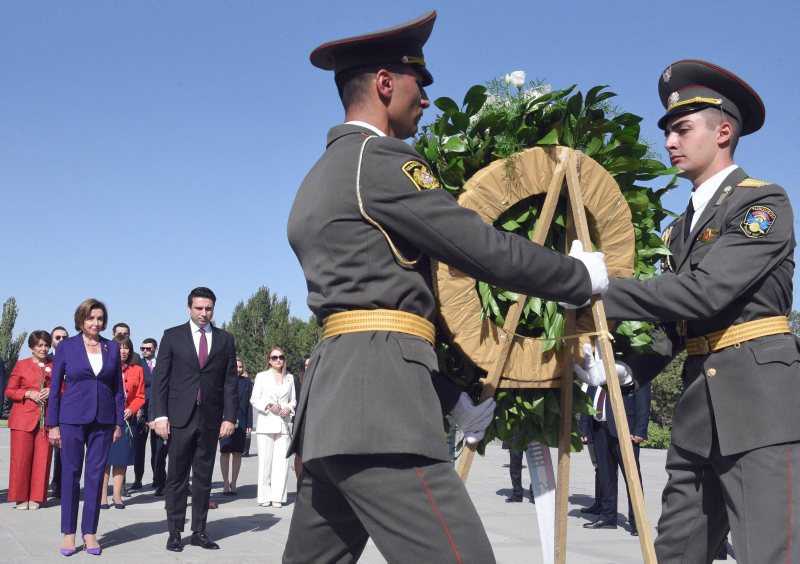 Heyet, sabah saatlerinde Erivan'da sözde Ermeni soykırımı kurbanları için yaptırılan Tsitsernakaberd Anıtı'nı ziyaret etti. Daha sonra Ermenistan Ulusal Meclis Başkanı Alen Simonyan ile bir araya gelen Pelosi, daha ilk diplomatik görüşmesinde Azerbaycan ve Türkiye'ye yönelik kışkırtıcı ifadelerde bulundu.