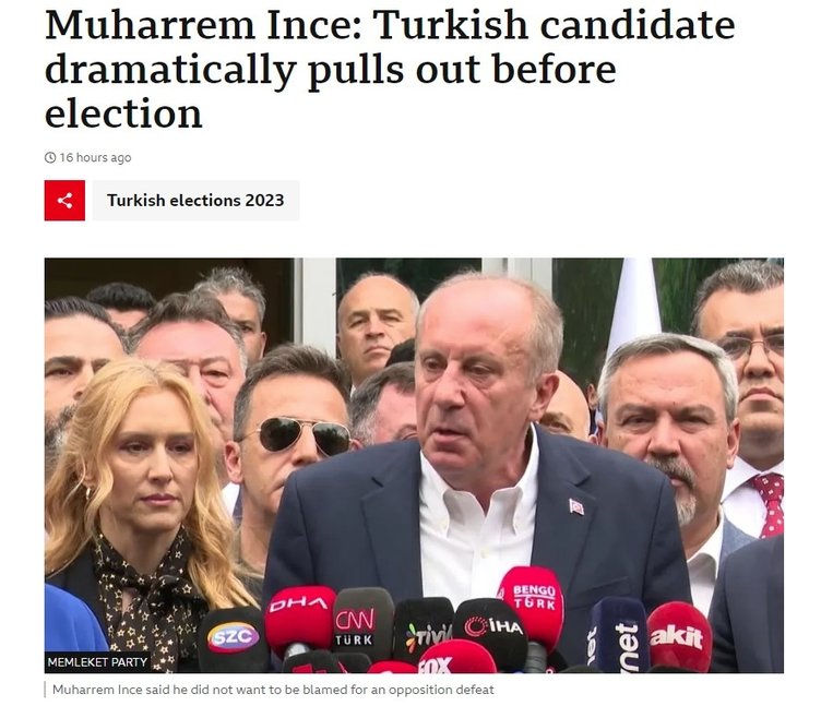 BBC de manşetinde dün akşam saatlerinde Muharrem İnce'den bahsetti. İnce'nin açıklamalarının son derece dramatik olduğundan bahseden gazete, Türkiye'de seçim sürecinin oldukça hızlı ilerlediğini ifade etti.
