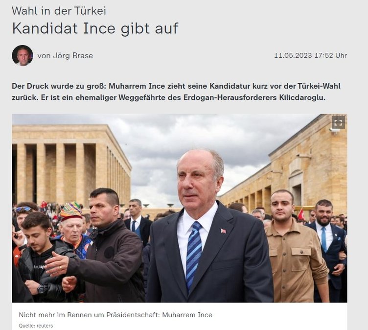 Alman gazetesi ZDF de manşetinde İnce'ye yer verenler arasındaydı. "Baskı çok büyüktü" yorumu yapılan haberde İnce'nin Cumhuriyet Halk Partisi lideri (CHP) ve cumhurbaşkanı adayı Kemal Kılıçdaroğlu'nun eski yol arkadaşı olduğu söylendi.