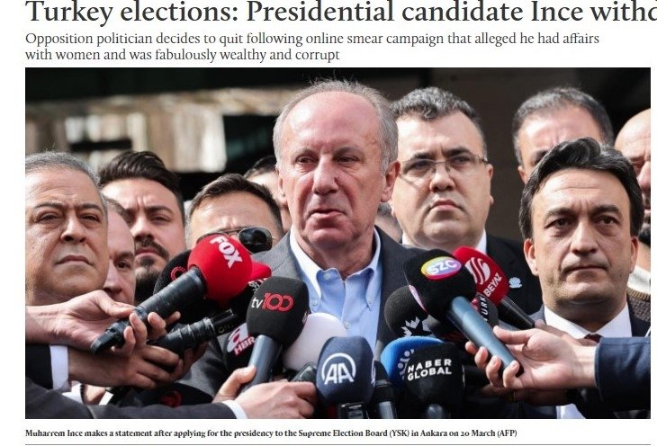 Middle East Eye (MEE) İnce'nin adaylıktan çekilmesiyle ilgili "Muhalefet politikacısı kadınlarla ilişkisini olduğu, inanılmaz derecede zengin ve yozlaşmış olduğu iddialarının ardından istifa etmeye karar verdi" denildi.