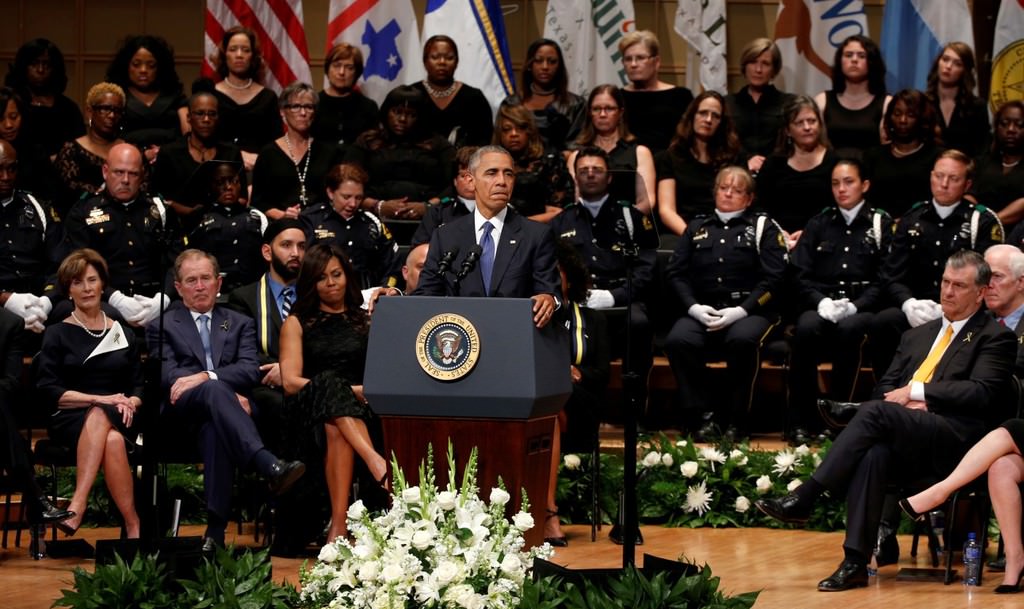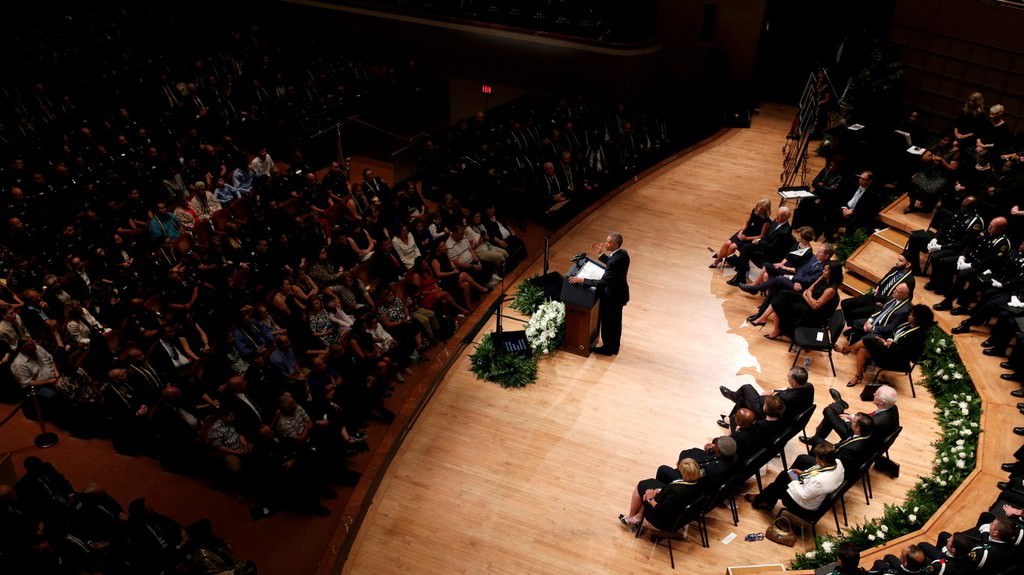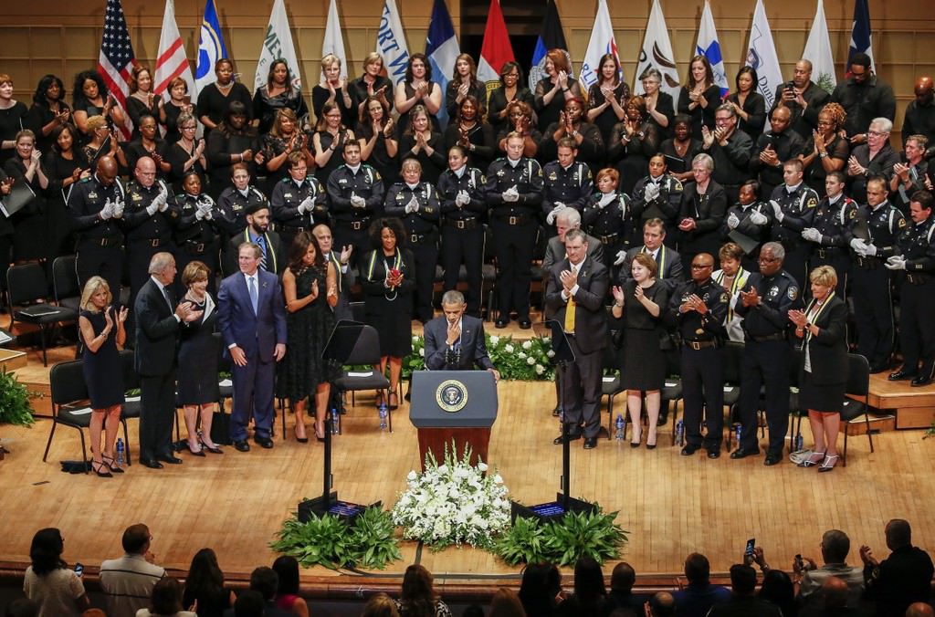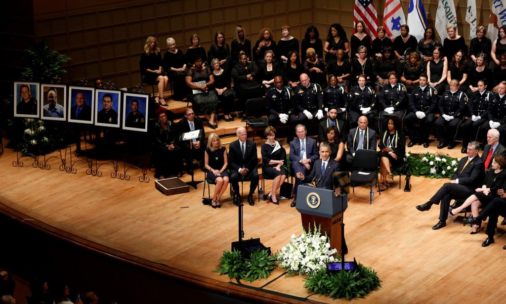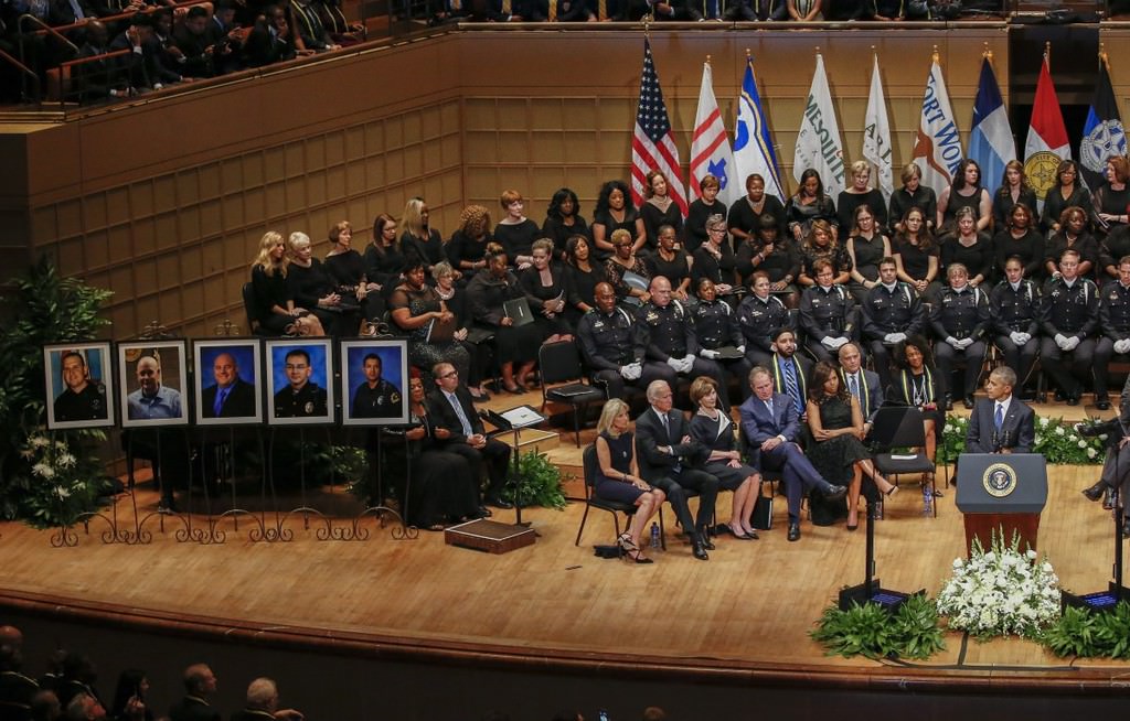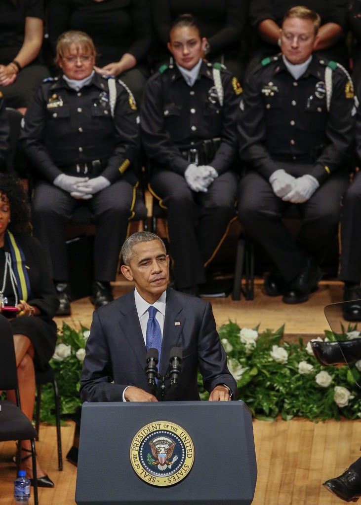 Obama, 7 Temmuz Perşembe günü Dallas'ta keskin nişancı saldırısı sonucu hayatını kaybeden beş polis memuru için Morton H. Meyerson Senfoni Merkezi'nde düzenlenen törene katıldı.