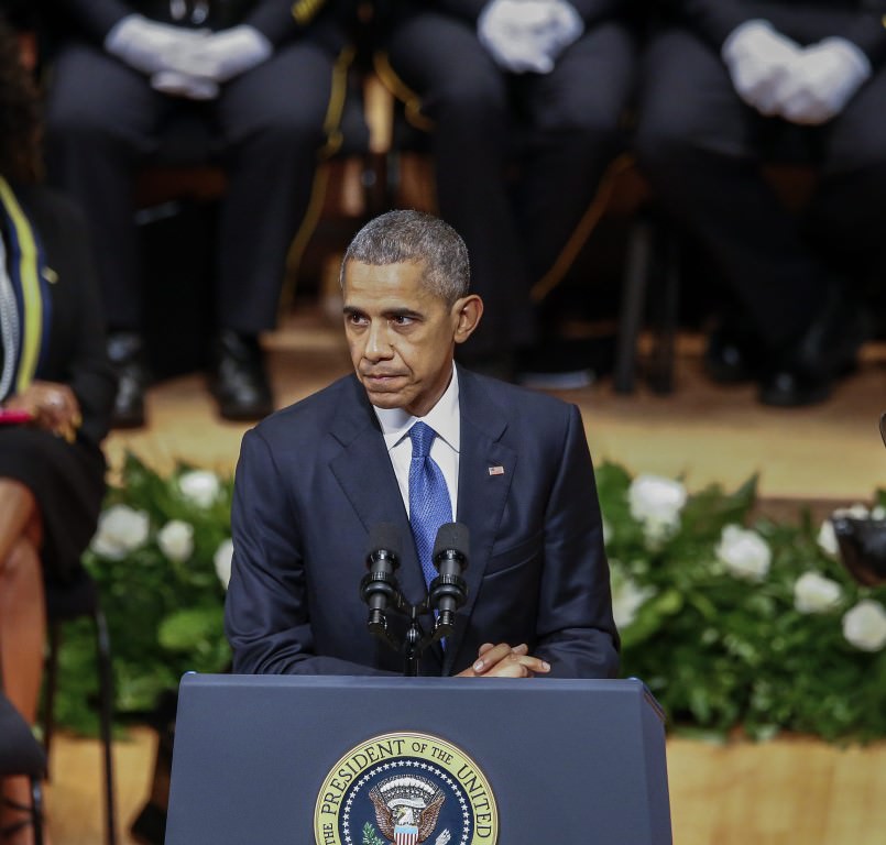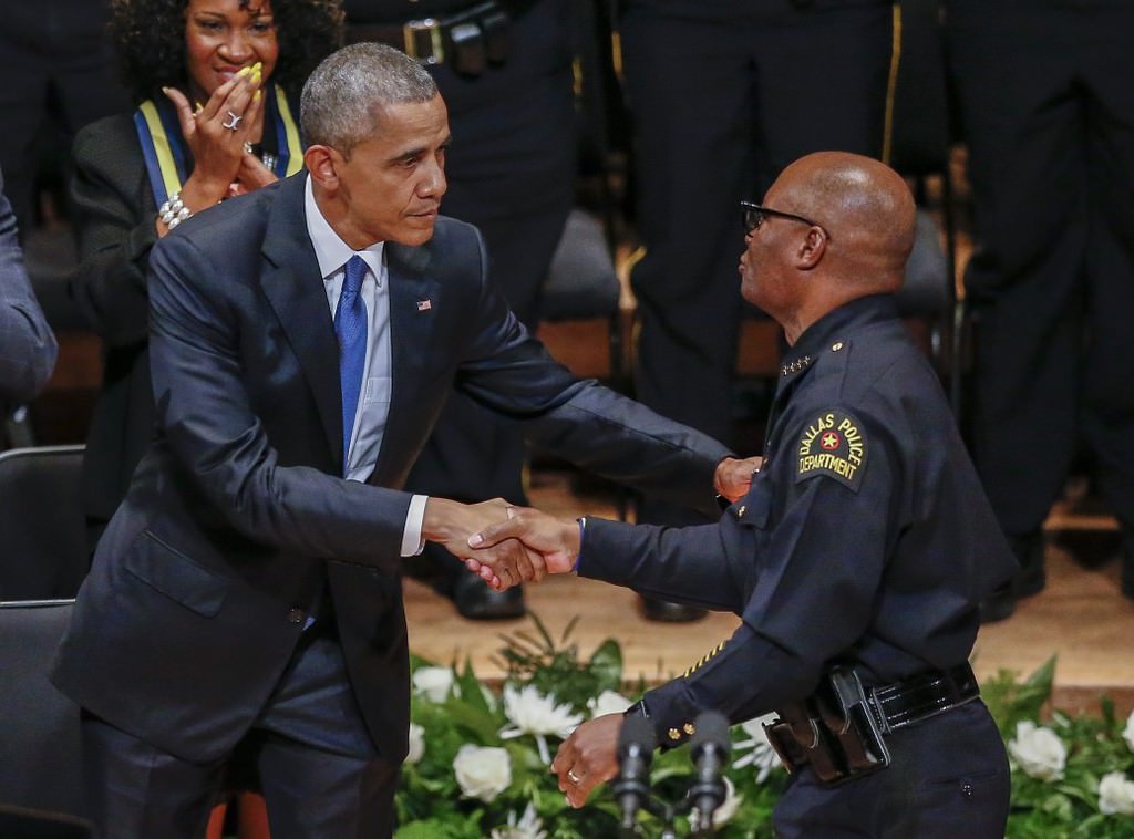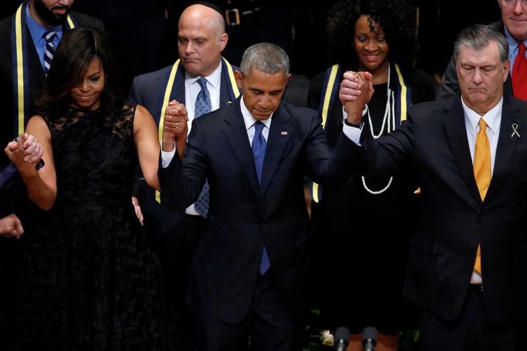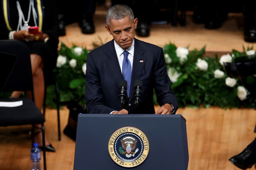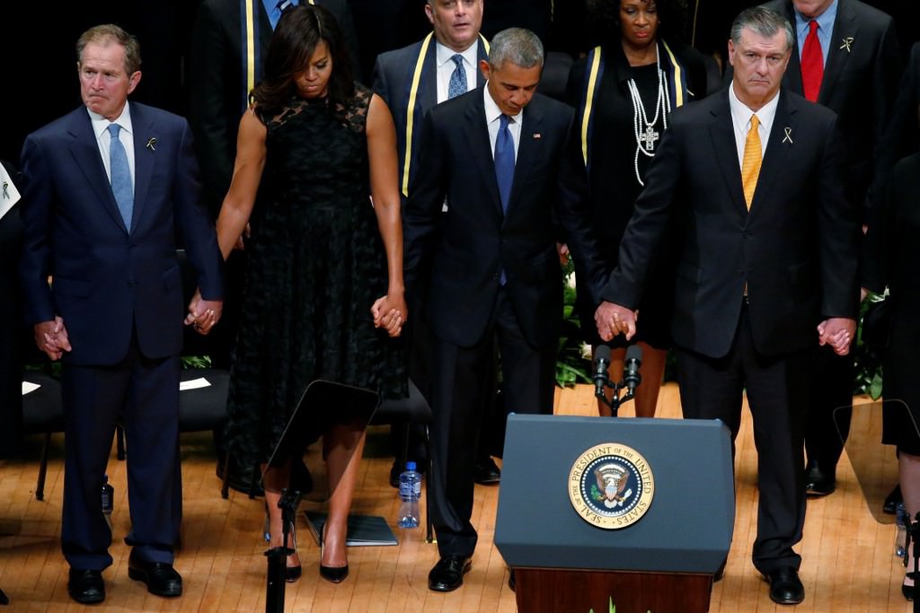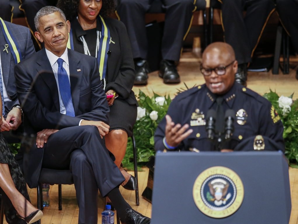 Obama, 7 Temmuz Perşembe günü Dallas'ta keskin nişancı saldırısı sonucu hayatını kaybeden beş polis memuru için Morton H. Meyerson Senfoni Merkezi'nde düzenlenen törene katıldı.