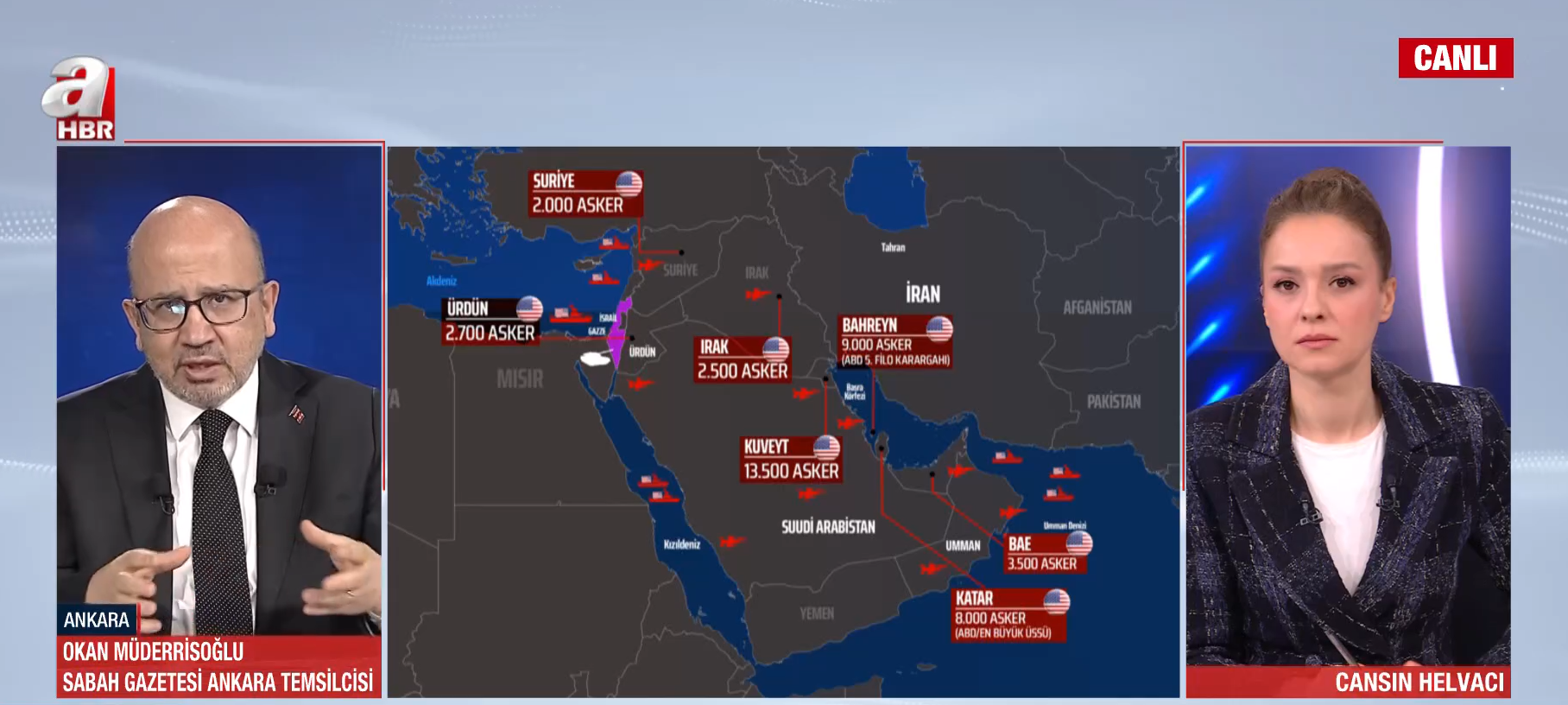 ABD'nin bölgedeki devasa askeri yığınağını değerlendiren Sabah Gazetesi Ankara Temsilcisi Okan Müderrisoğlu, "Başkan Trump'ın çalışma metodolojisi mutlaka işin ekonomik karşılığını Amerika lehine oluşturmakla ilgili. Onun dışındaki güç gösterileri, esasen iç kamuoyuyla ve yaklaşan ara seçimlerle çok daha bağlantılı" ifadelerini kullandı. Trump'ın seçim döneminde "savaş gemilerini geri döndüreceğim, bunlar boşa para harcamak" dediğini hatırlatan Müderrisoğlu, bugün gelinen noktada ABD'nin İran'ın zengin doğal kaynaklarını göz önünde bulundurarak farklı bir arka plan pazarlığı yürütebileceğine dikkat çekti.