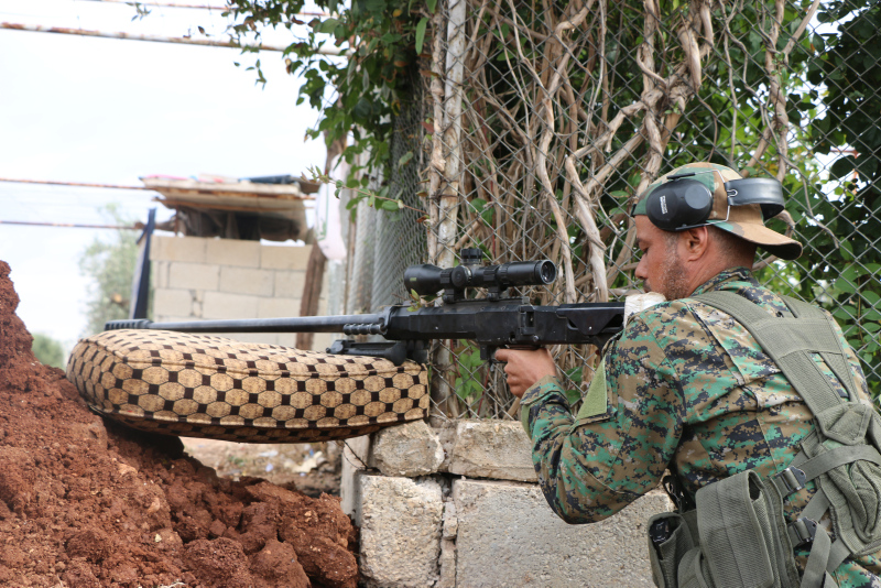 Münbiç tarafındaki cephe hattı içinden çekilen fotoğraflarda, teröristler, Türk Silahlı Kuvvetleri ve Suriye Milli Ordusu kontrolündeki Cerablus yönünü gözetliyor.