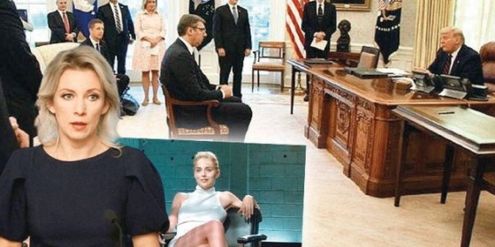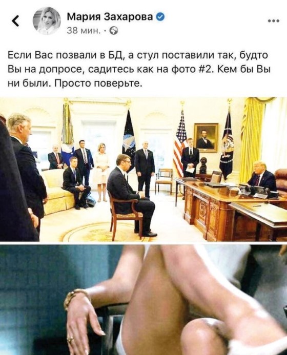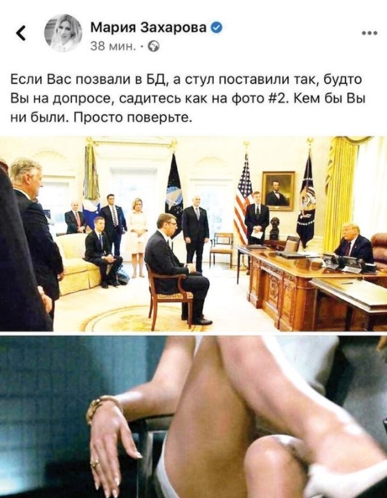 Sırbistan Cumhurbaşkanı Vucic'in, Trump tarafından uzak mesafede bir sandalyeye oturulmasını Facebook hesabından eleştiren Mariya Zaharova, "Sorguya çekilircesine, kendini üstün gören birinin karşısına oturtulduğunuzda tavsiyem 'Temel İçgüdü' filmindeki pozu almanızdır" diye yazdı. Zaharova bu alaycı ifadeyi kullanmakla kalmayarak adı geçen filmdeki Sharon Stone'un oturma anından bir kareyi de Vucic ile Trump görüşmesi resminin altına ekledi.